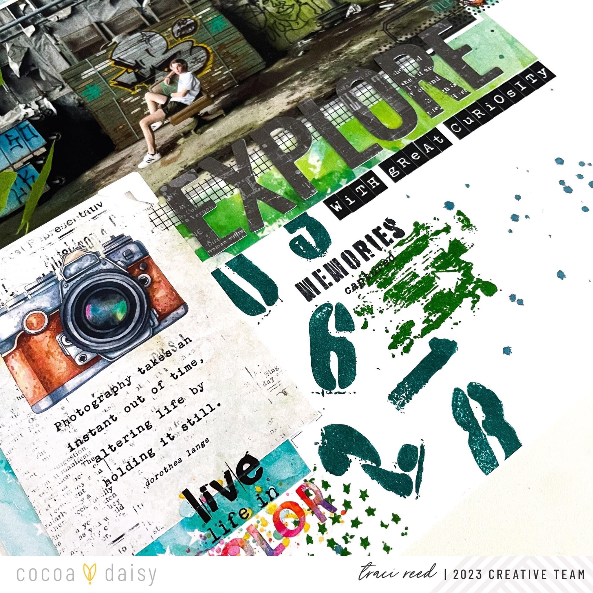 To frame the central composition, I applied different rub-ons over the photos and cards. This gave an even more mixed-media look and framed the layout. I wrapped it up by adding the finishing touches with my title, spelling out “explore” using the large cardstock alpha from the Daily Journal Classified Memory Keeping Kit and arranging “with great curiosity” using the small black alpha Daily Journal Modern Memory Keeping Kit, mixing uppercase and lowercase letters to add visual appeal.