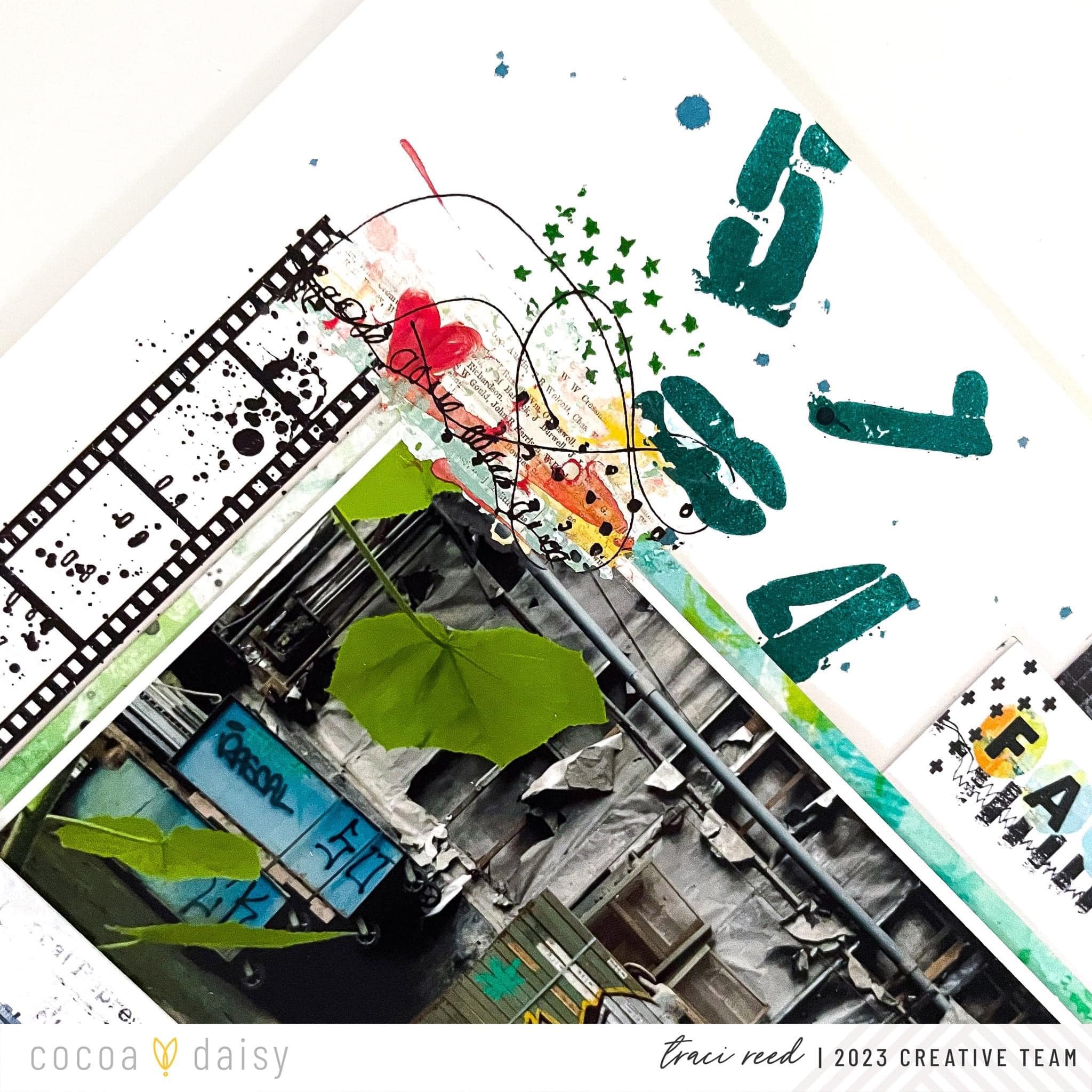 Using black ink, I started stamping phrases from the phrase stamps included in the Daily Journal Classified Memory Keeping Kit, then I got artistic by using green and black ink to stamp various art journal-style stamps from the Daily Journal Memory Keeping Stamps around my composition then splattered with more teal ink from an older Cocoa Daisy Collection.