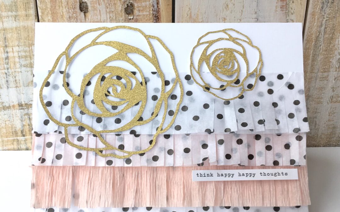 On this card I used the die cut files from the April kit to create this sweet little flower. The die cuts could be layered and layered for a beautiful effect. Again, I added some more fringe with crepe paper and the Cocoa Daisy polka dot tissue paper that comes with the kits…I can’t seem to  get enough of this tissue paper!