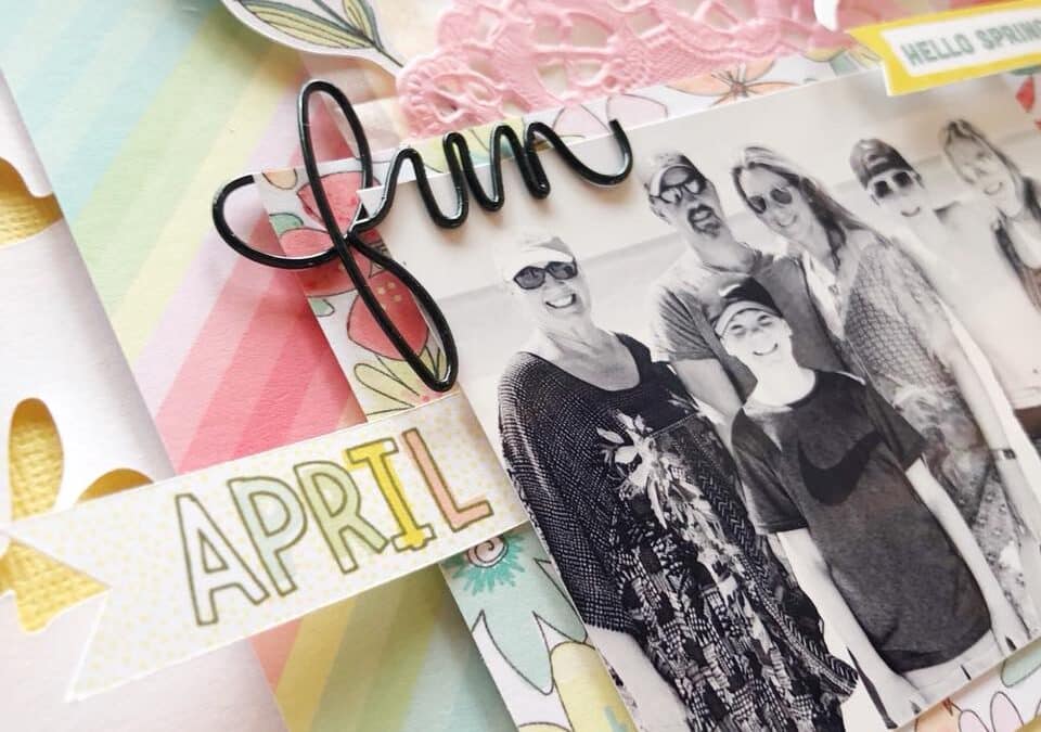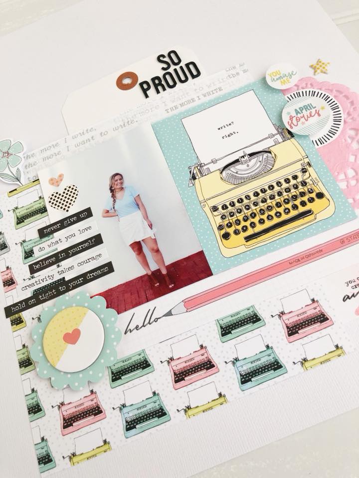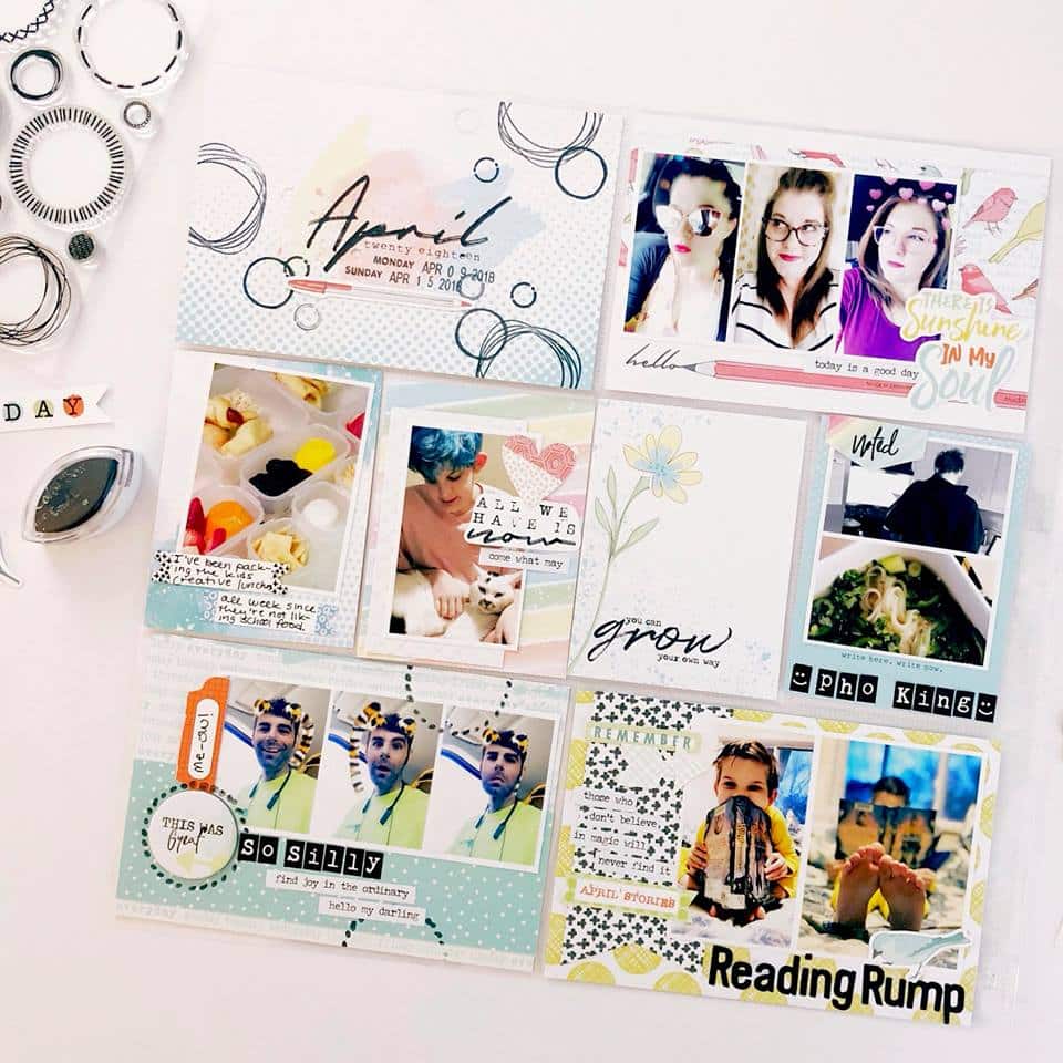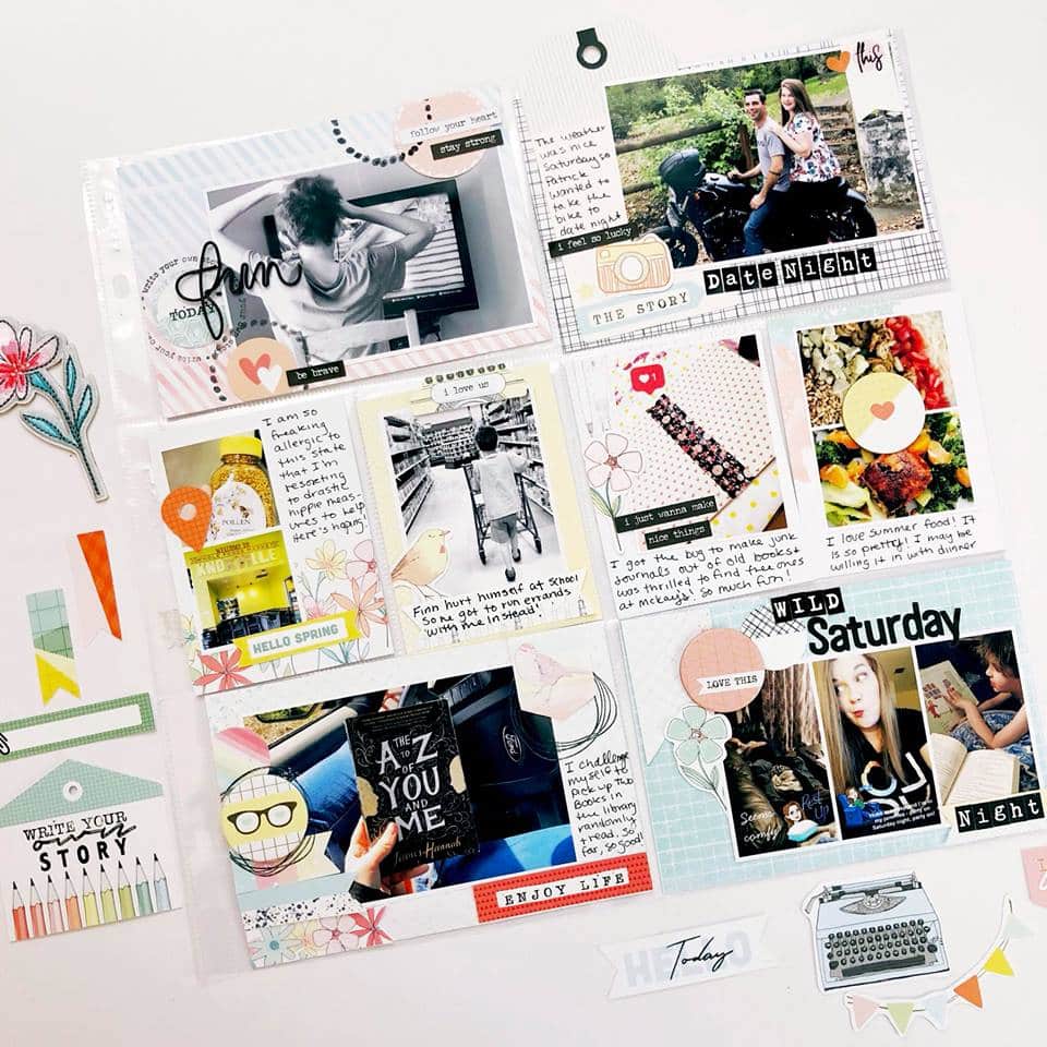 ‘Here is another 12×12 layout using the April pocket memory kit. My daughter won a media day contest at school where she had to interview a person and write up a bio on them. This paper was perfect for the theme! I also used a printable to frame ‘April stories’ . The tag was from my own stash.’