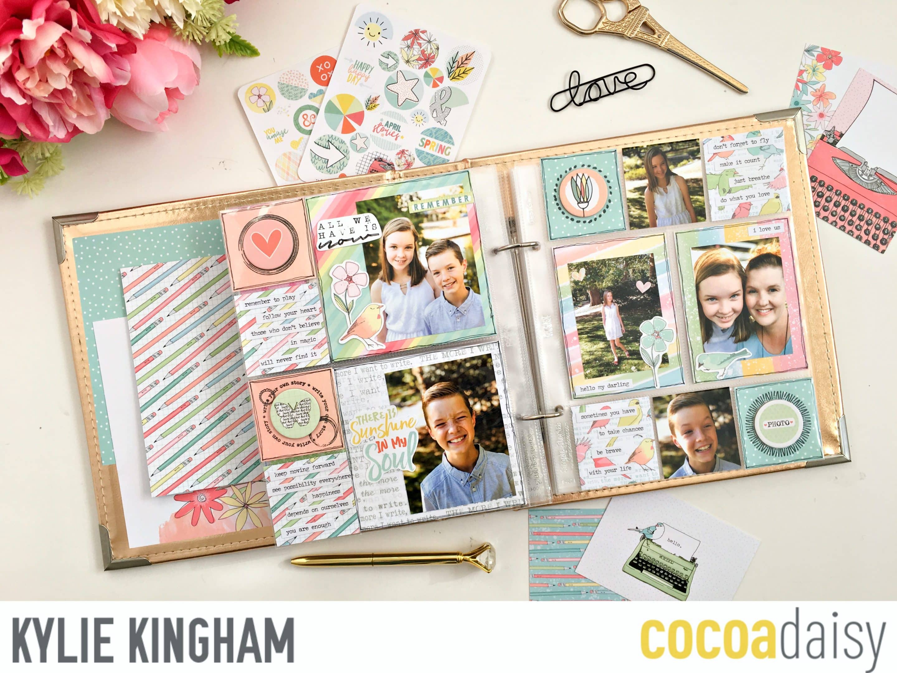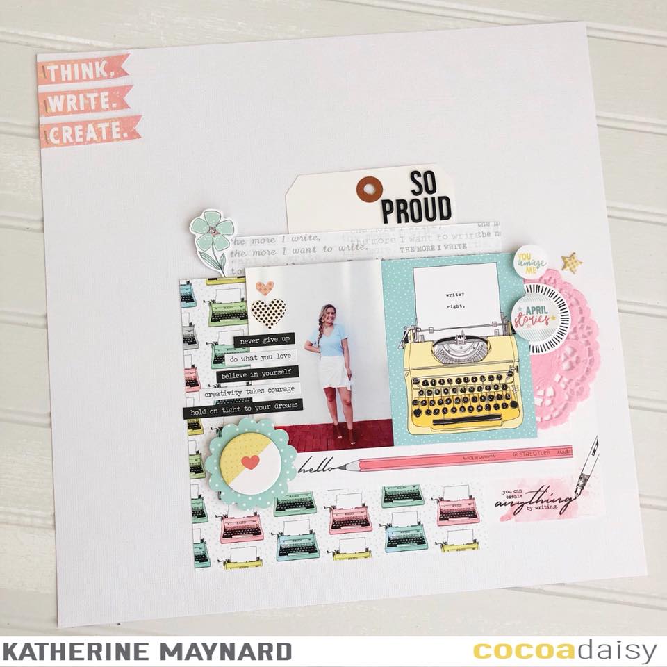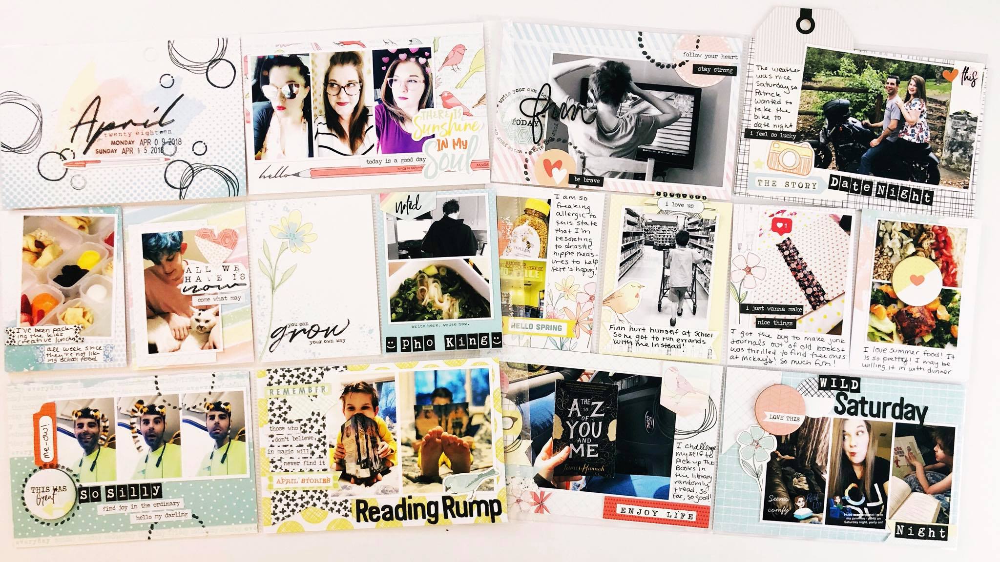 ‘Here is another 12×12 layout using the April pocket memory kit. My daughter won a media day contest at school where she had to interview a person and write up a bio on them. This paper was perfect for the theme! I also used a printable to frame ‘April stories’ . The tag was from my own stash.’