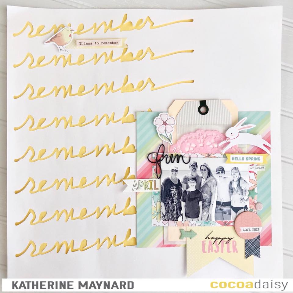 Here is a 12×12 layout where I used the pocket memory kit. The background paper was from a layout I made last month. (It was the one where I stacked all of the “remember” words to make one thick word.) The black banner was from the April printable. The bunny I think was from last April or March? I used the glycine bag from the kit to store the tags for journaling and more pictures. The tag and doily were from my own stash. I love the dimension and layers.’