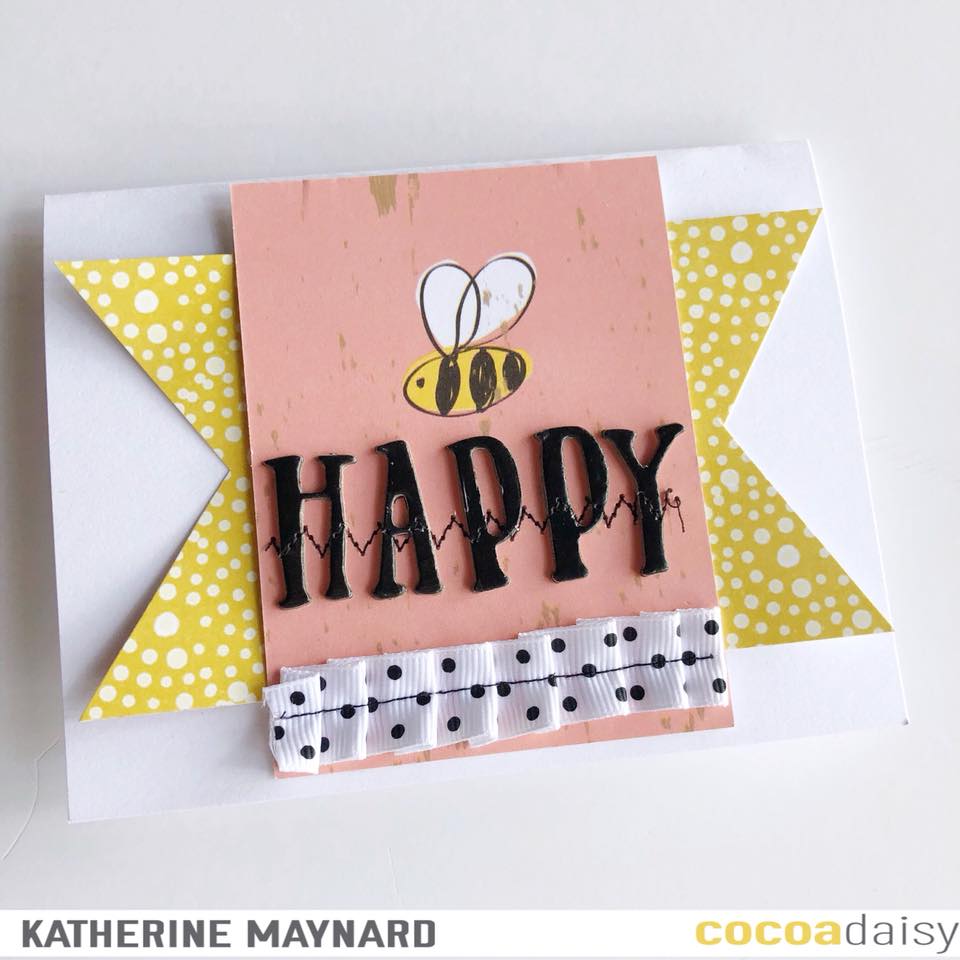 “Bee Happy” Here’s a quick and easy card that I made with a journaling card. Did a little stitching with my sewing machine to attach alphas and ribbon.