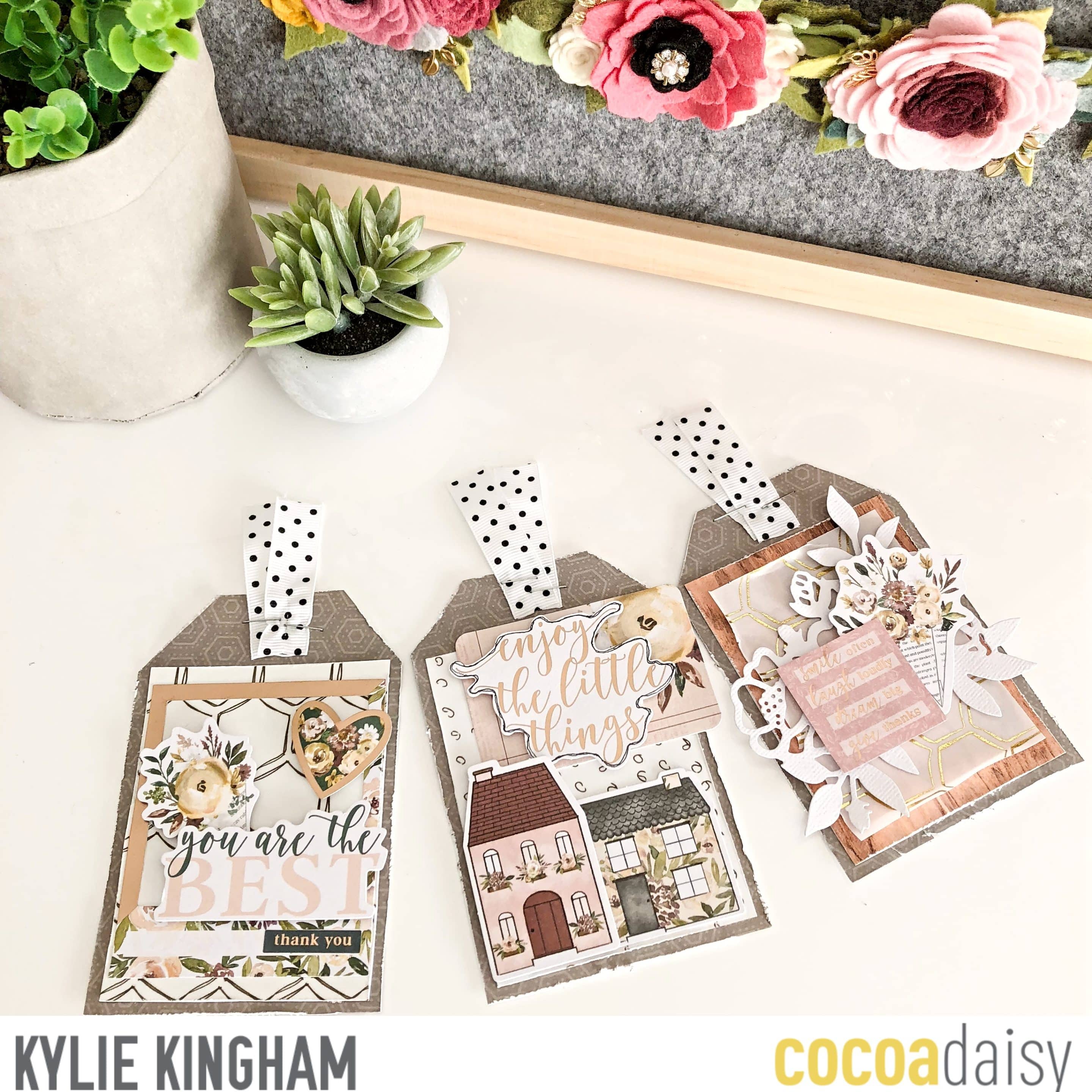 Next is a trio of gift tags created my me….Kylie (Helloooo!) I enjoyed layering some of the embellishments with foam tape to help them have a multi dimensional effect.