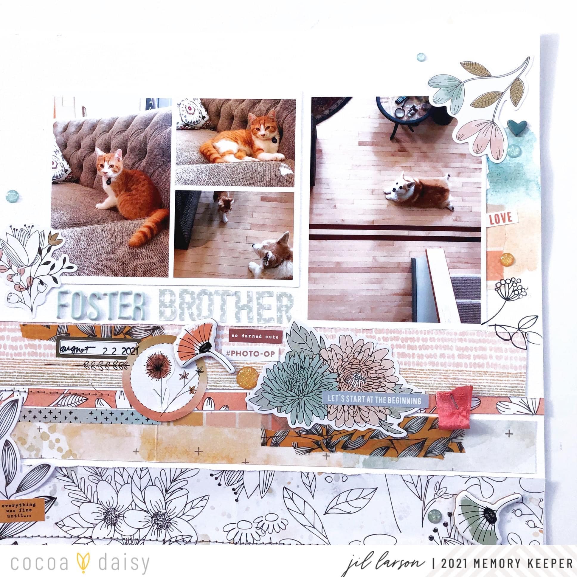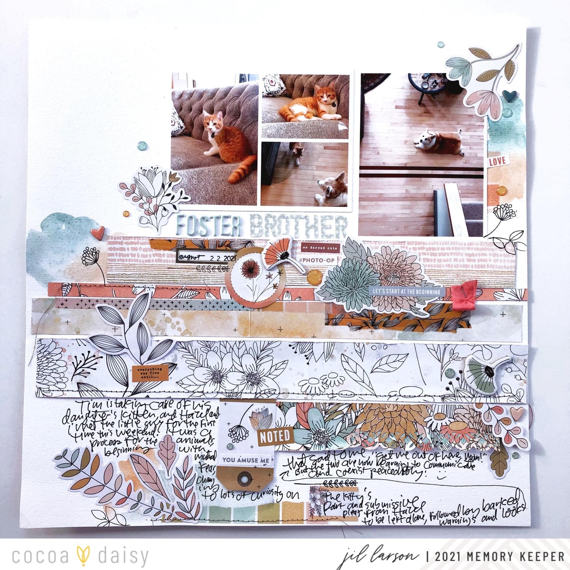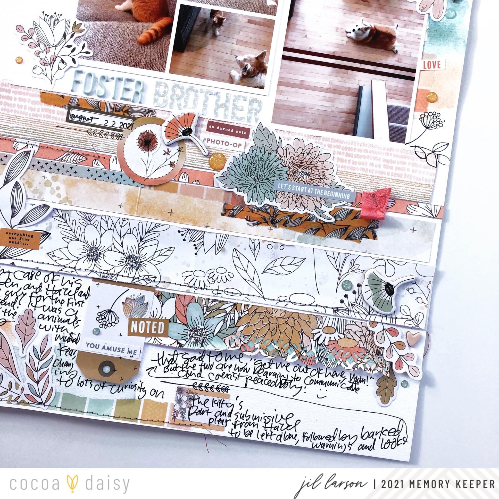 Besides wanting to tell the story of their developing relationship, I wanted to showcase the gorgeous ginger color of both creatures with lots of the Doodles and Dashes Memory Keeping Papers and washi tape from the kit, along with watercolor in the Doodles & Dashes color scheme.