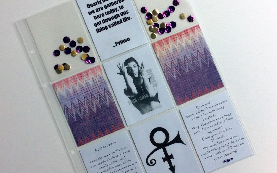 April’s challenge this month was to use “reflect” on your project in a way that you saw fit; be it a reflective element, reflective journaling, the word “reflect”. Terry Boyer did a phenomenal job with this challenge reflecting back upon how Prince was a part of her past in her tribute pocket page.