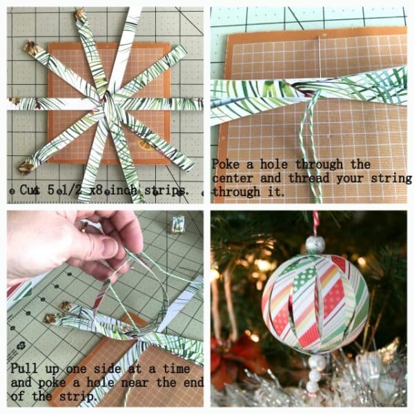 Here is the first ornament, the sphere.  You need 5 – 1/2×8 inch strips.  Poke a hole through the center; it is easier if you also poke holes through each end now.  Make sure your string is long enough.  And a binder clip to hold each strip as you assemble the sphere is a really good idea!