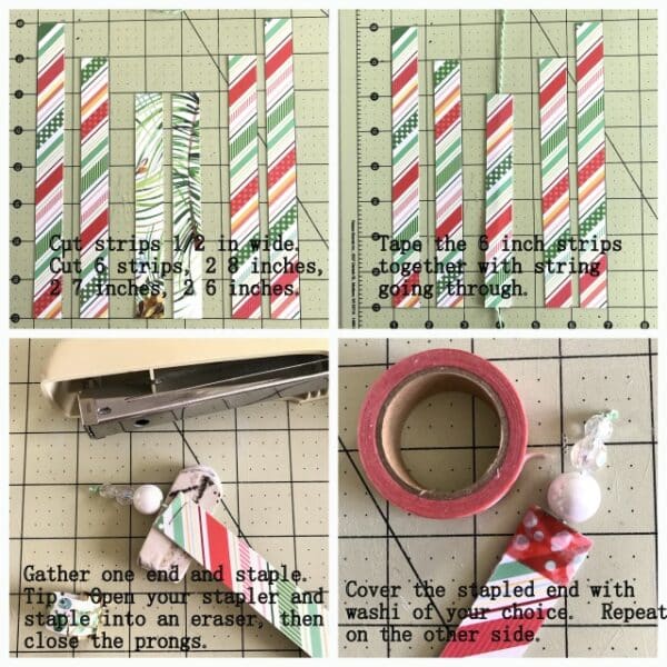 The next ornament, the long one, needs 2- 3/4×8 inch strips, 2- 3/4×7 inch strips, 2- 3/4×6 inch strips.  Take the 6 inch strips and run string through them and seal them up, make sure your string is long enough.  Gather all the strips at one end and staple them together using the eraser trick shown below.  Repeat.  Finish with washi tape and decorative beads.
