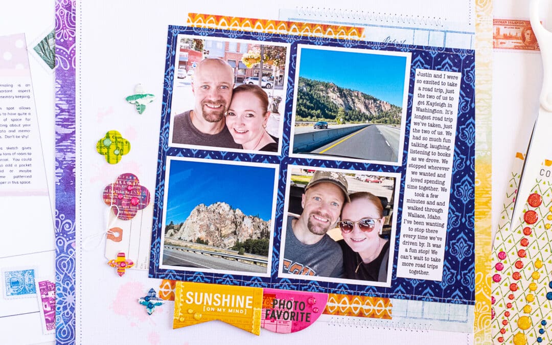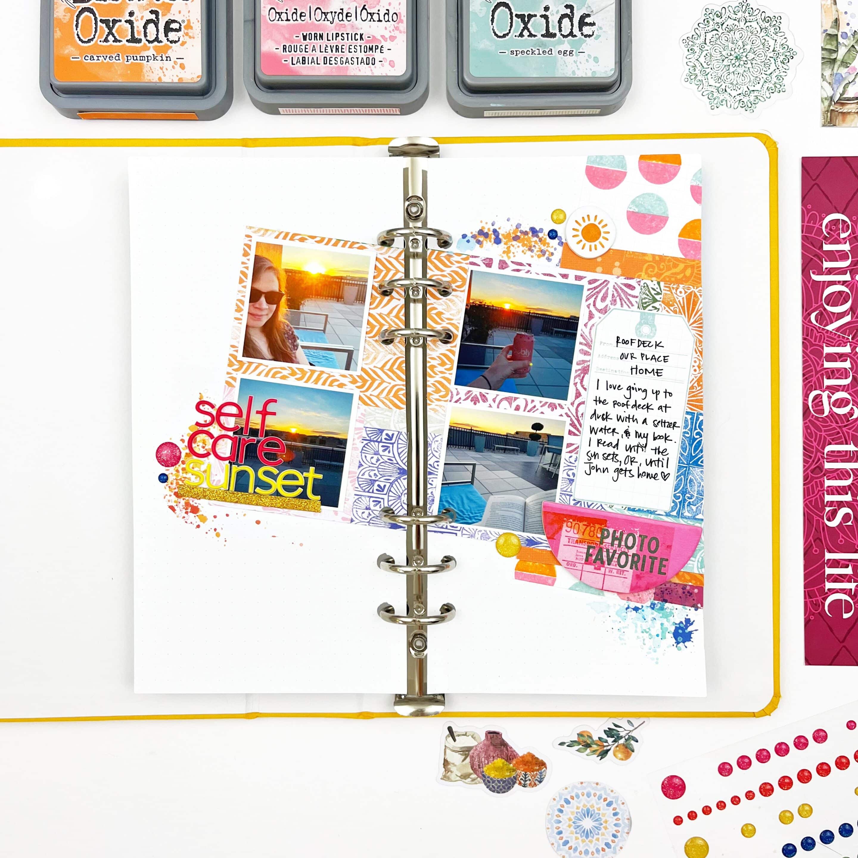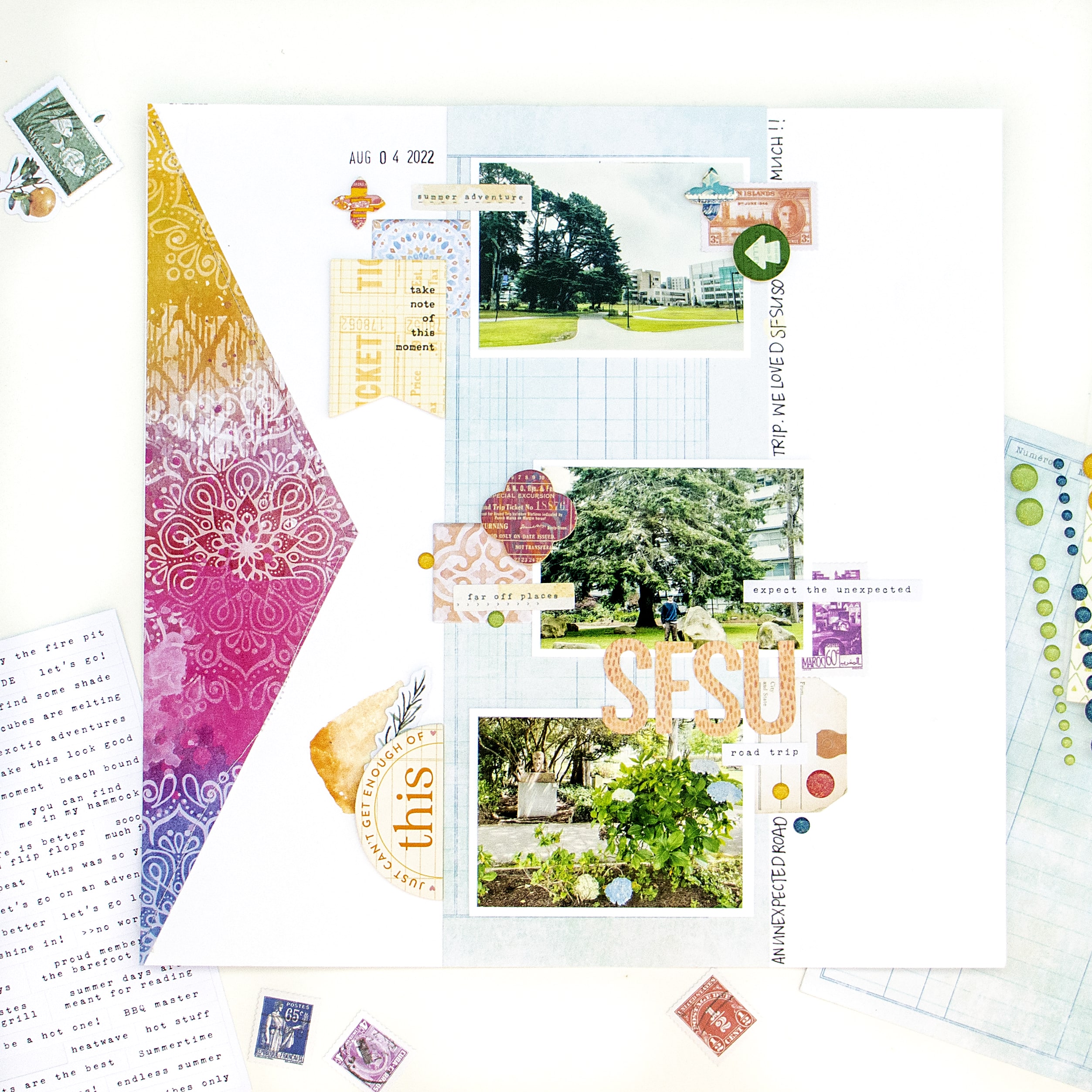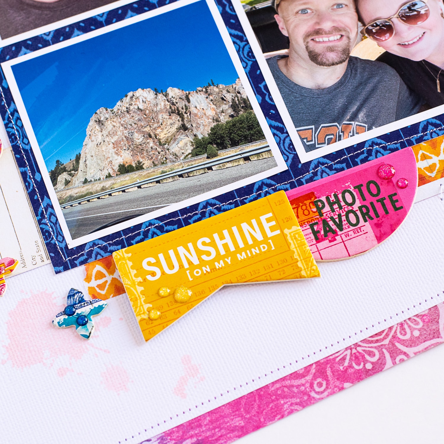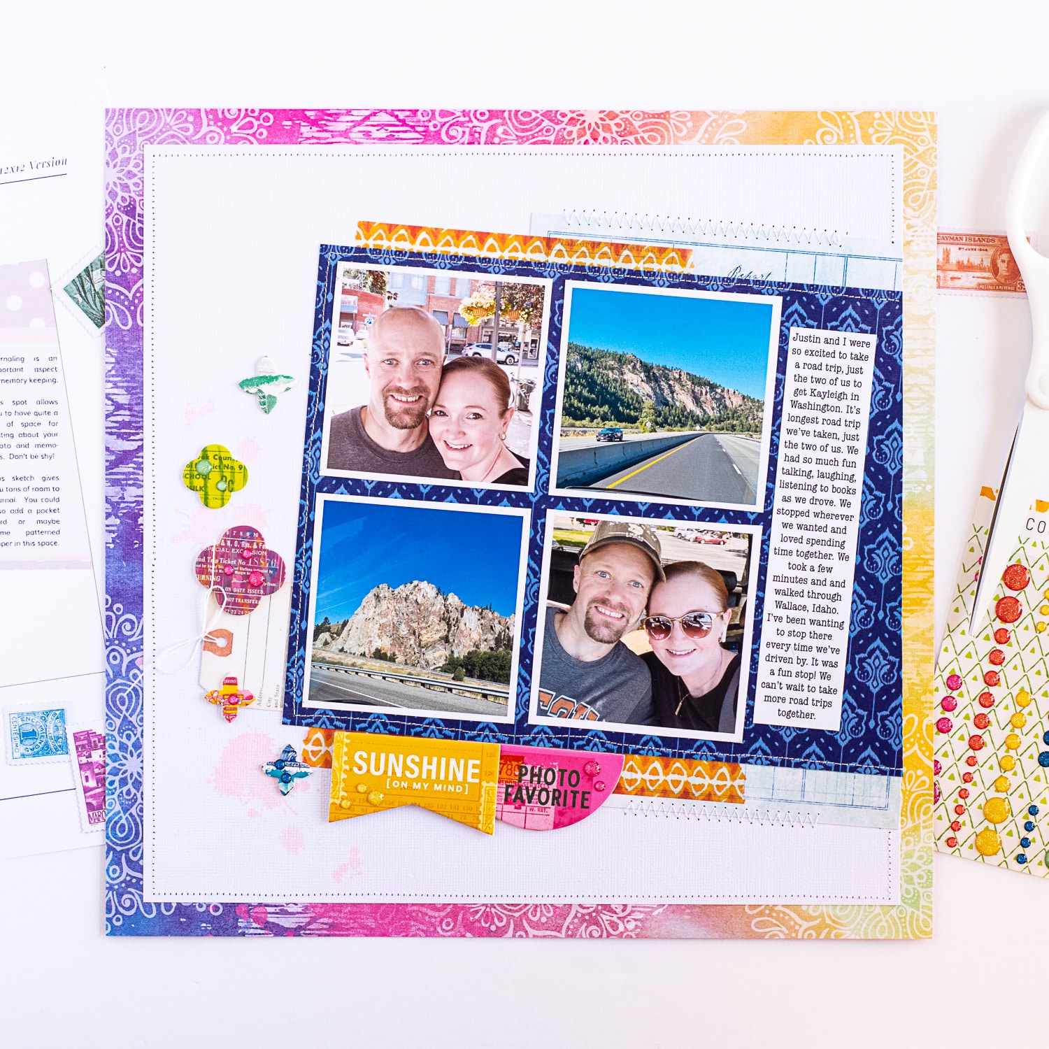 I was giddy when I saw this sketch, it had three things that I LOVE: lots of photos, a grid design, and room for lots of journaling. As with most layouts, the first thing I did was look through the products to choose what theme the layout would be. Of course, this helped with my photo selection. After printing my photos, I jumped in and started creating! I had so much fun playing with a couple of the patterned papers in the Spice Market Collection. The patterned papers in this kit are gorgeous! I fell in love with the rainbow mandala paper and the dark blue paper. I wanted these two papers to be the main focus of my project so I used the rainbow paper as my background and the blue paper to frame my photos.