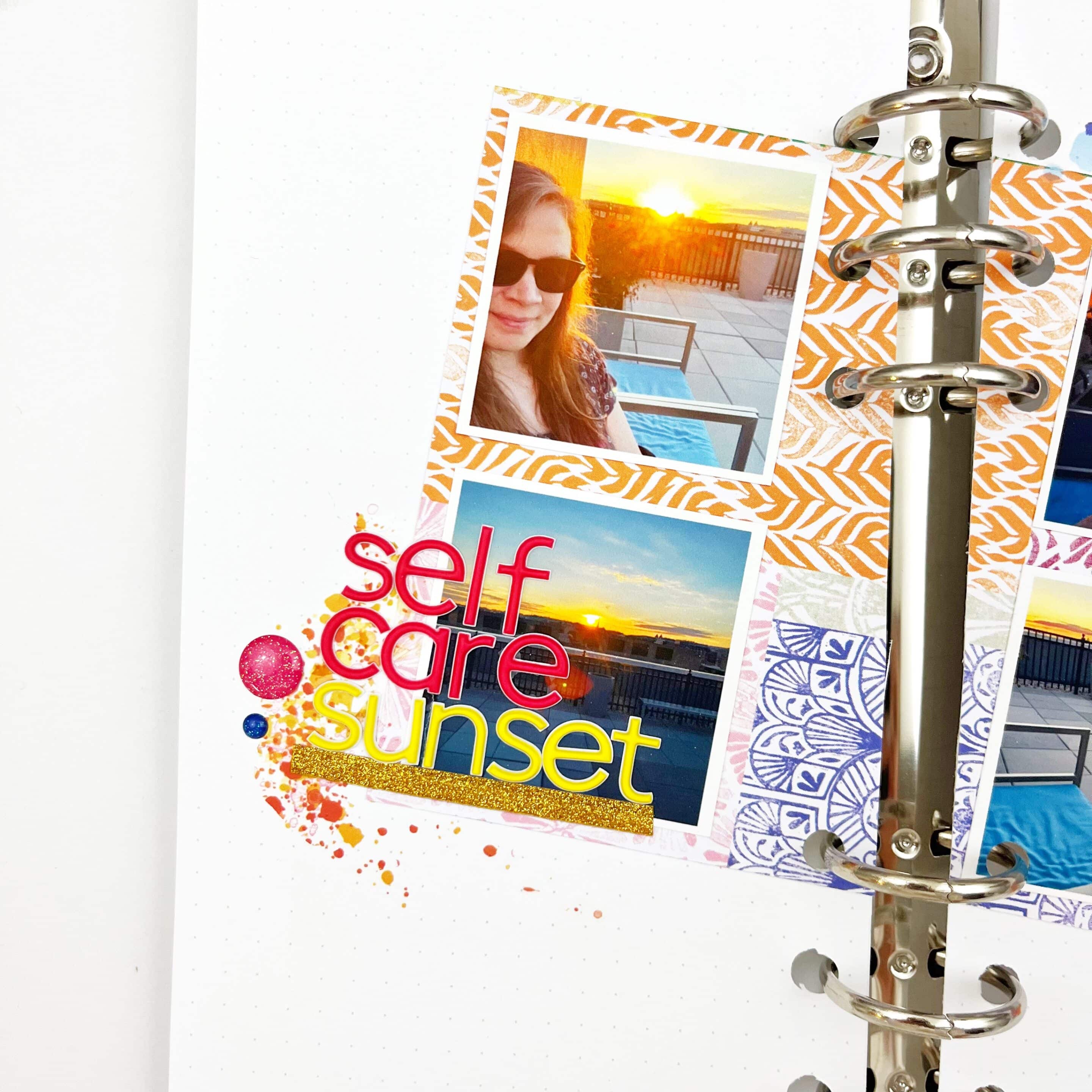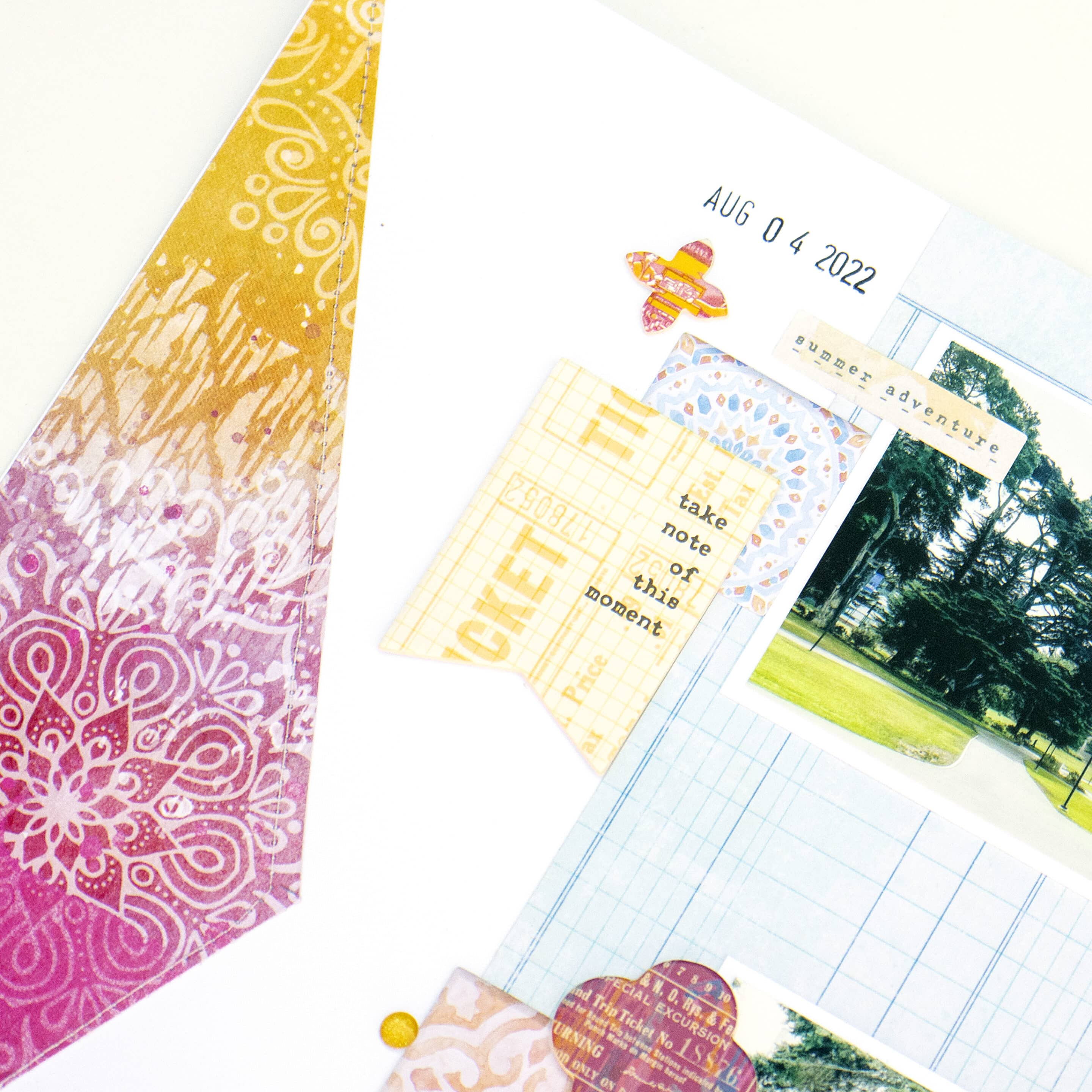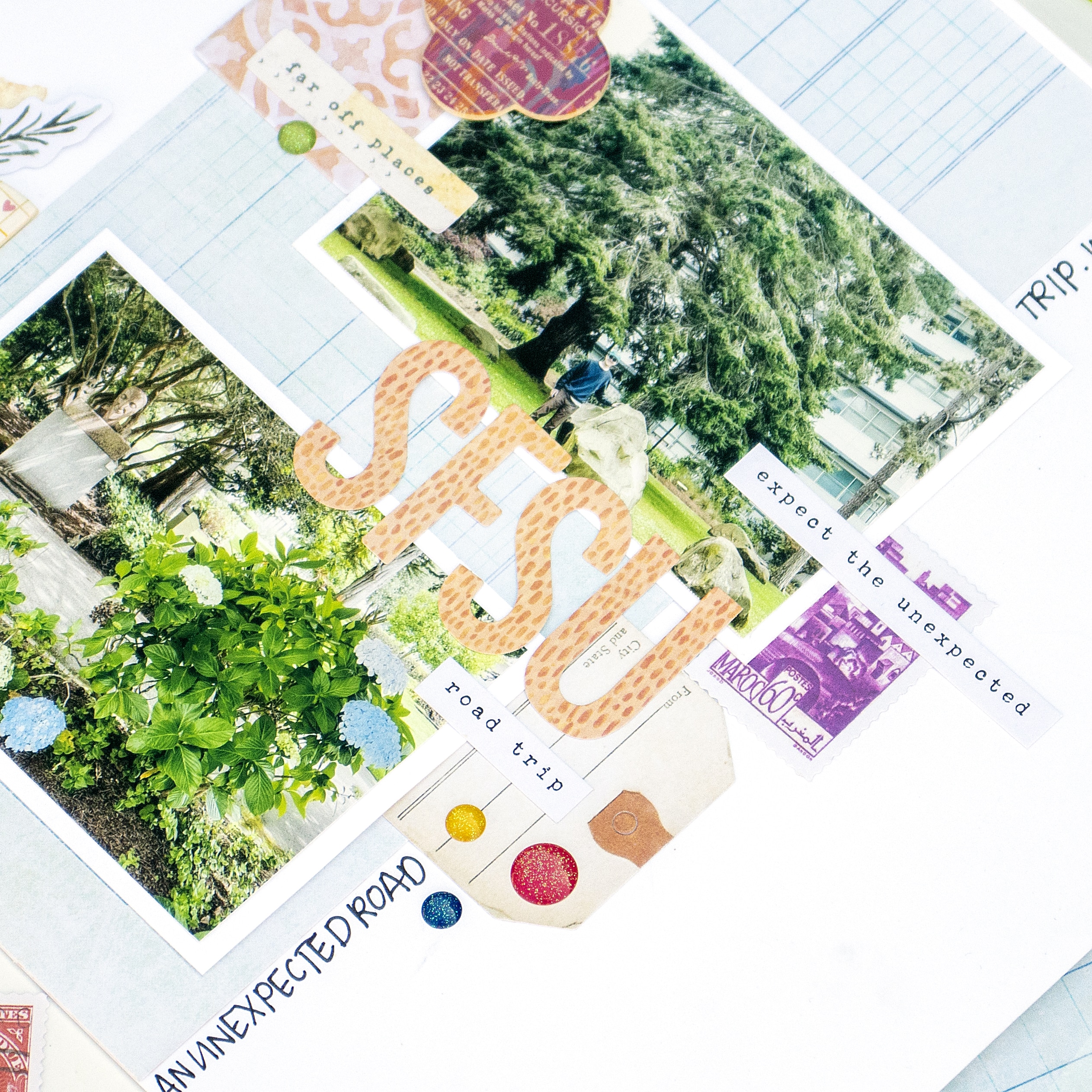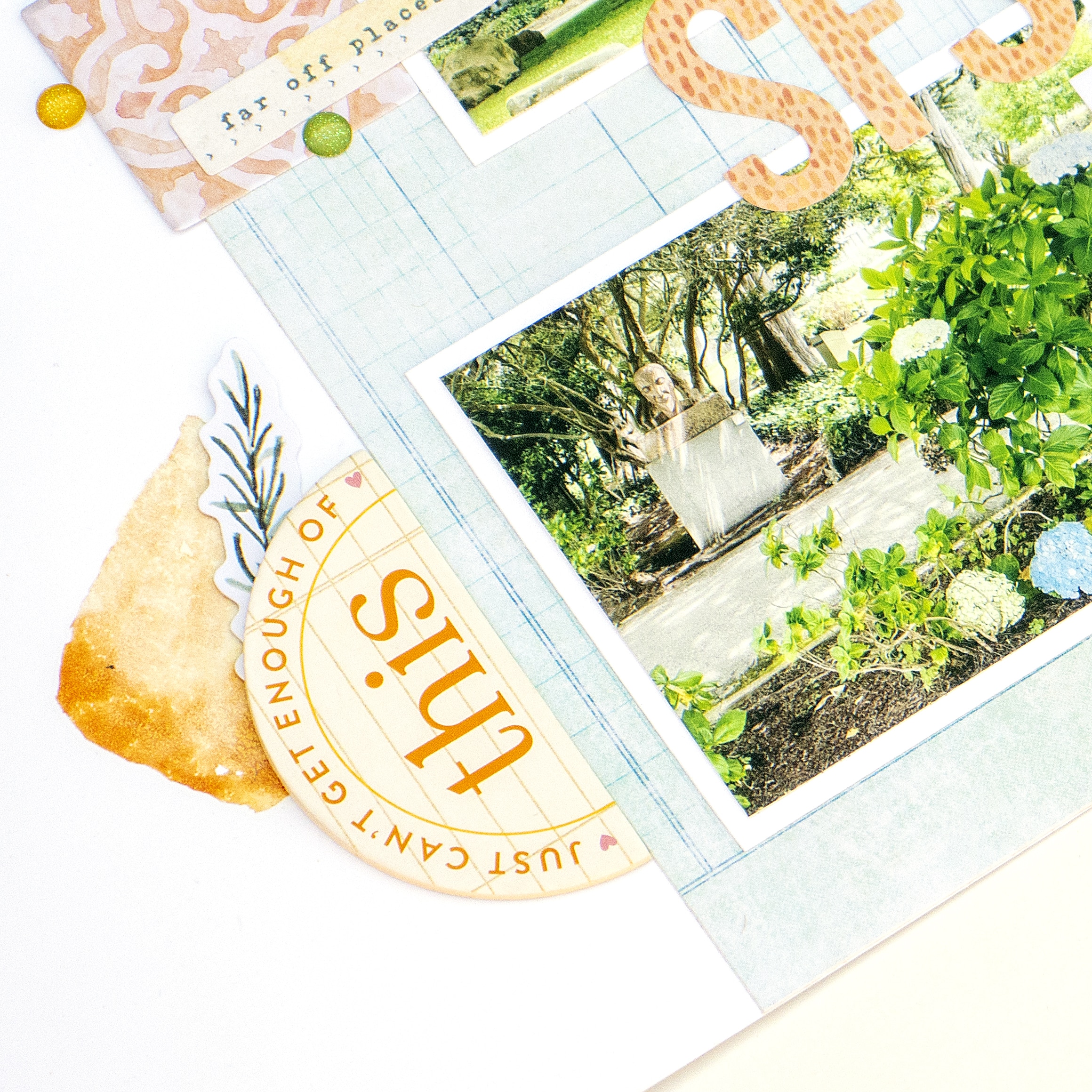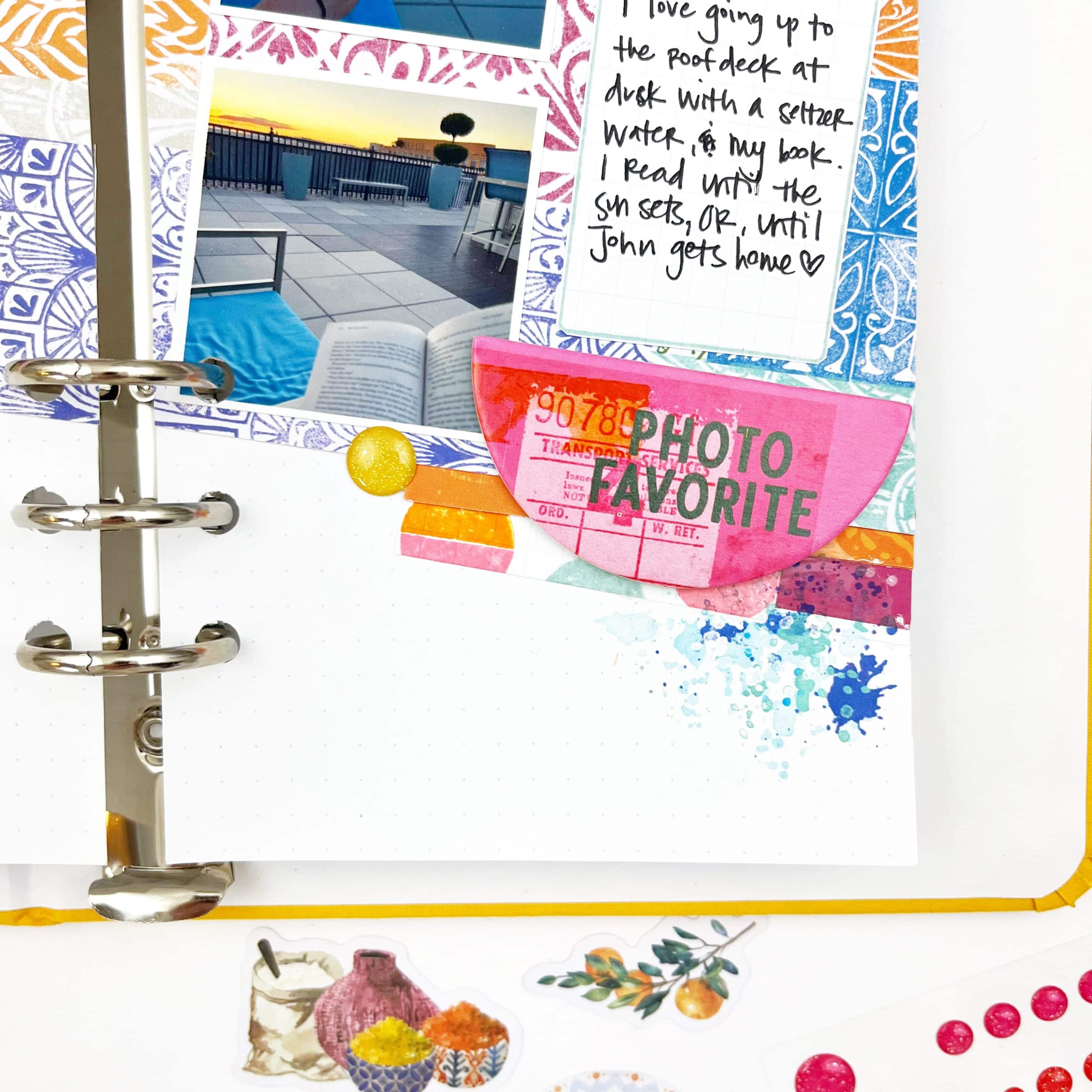 This sketch was one of my favorites to work with because it pushed me out of my comfort zone! I use grid designs frequently but never at an angle like this. I’m not sure what that says about me, but I had fun going against my linear tendency to put this spread together. For the larger paper element, I chose one of the pattern papers from the Spice Market Traveler’s Notebook Memory-Keeping Kit with several colors to play off the color in my photos.