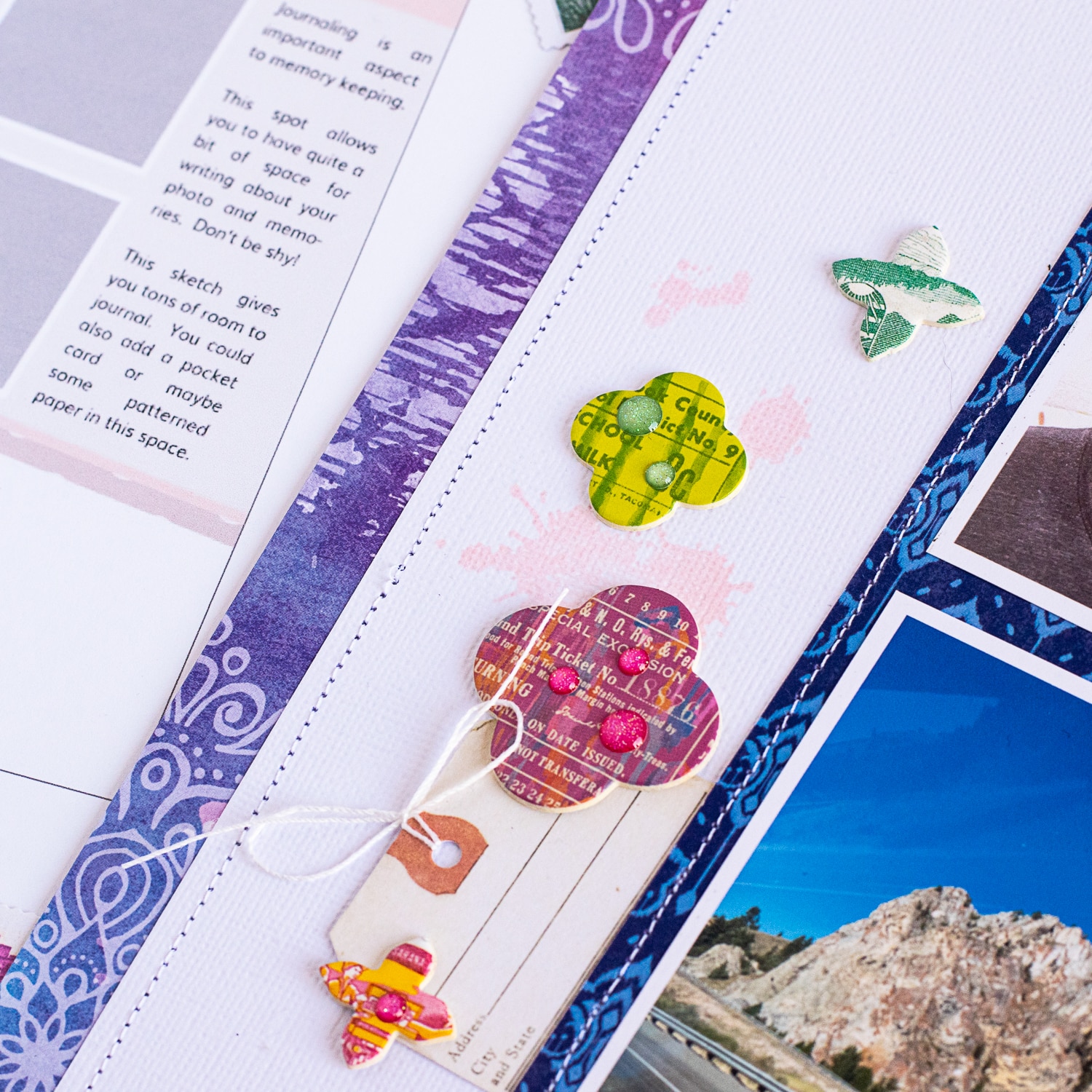 The main area of embellishment on this sketch is toward the bottom right corner of the photo around the title. I stayed close to the sketch, but I did take the embellishment cluster up the left side of the photo as well.