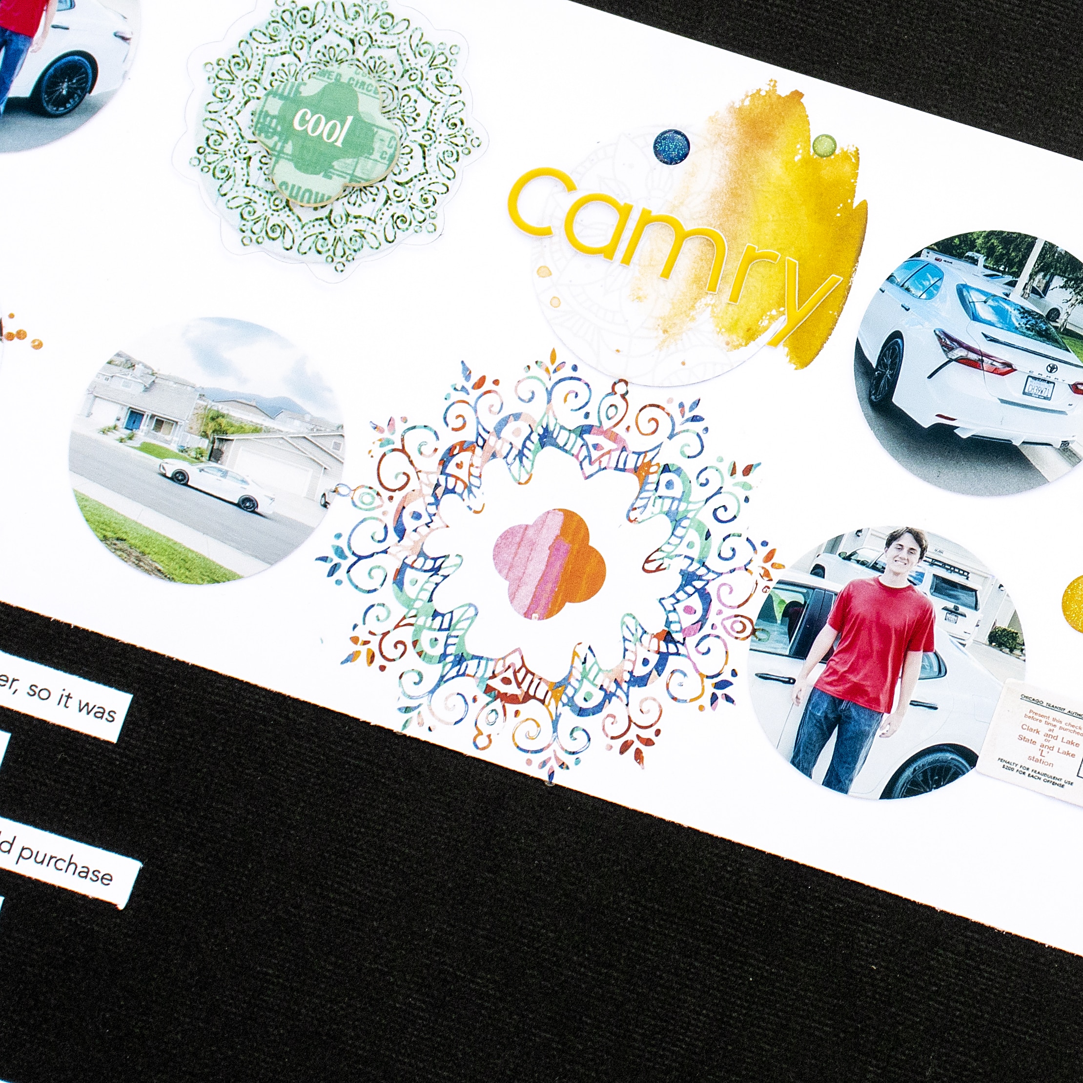 I love the simple “twist” of this sketch by simply rotating the alignment from horizontal to vertical. This is a great reminder that you can do this with any sketch! I especially liked that the grid was clustered toward the center of the spread, something I don’t usually do, but will need to do more. I did make a few minor tweaks to this sketch. First, I printed my photos slightly larger than what the sketch called for. My photos are 1.5 x 1.70, not quite square, and too large for to fit all the grid square the sketch called for. With the long line for the vertical grid, the rectangular size of the photos worked better with the design.