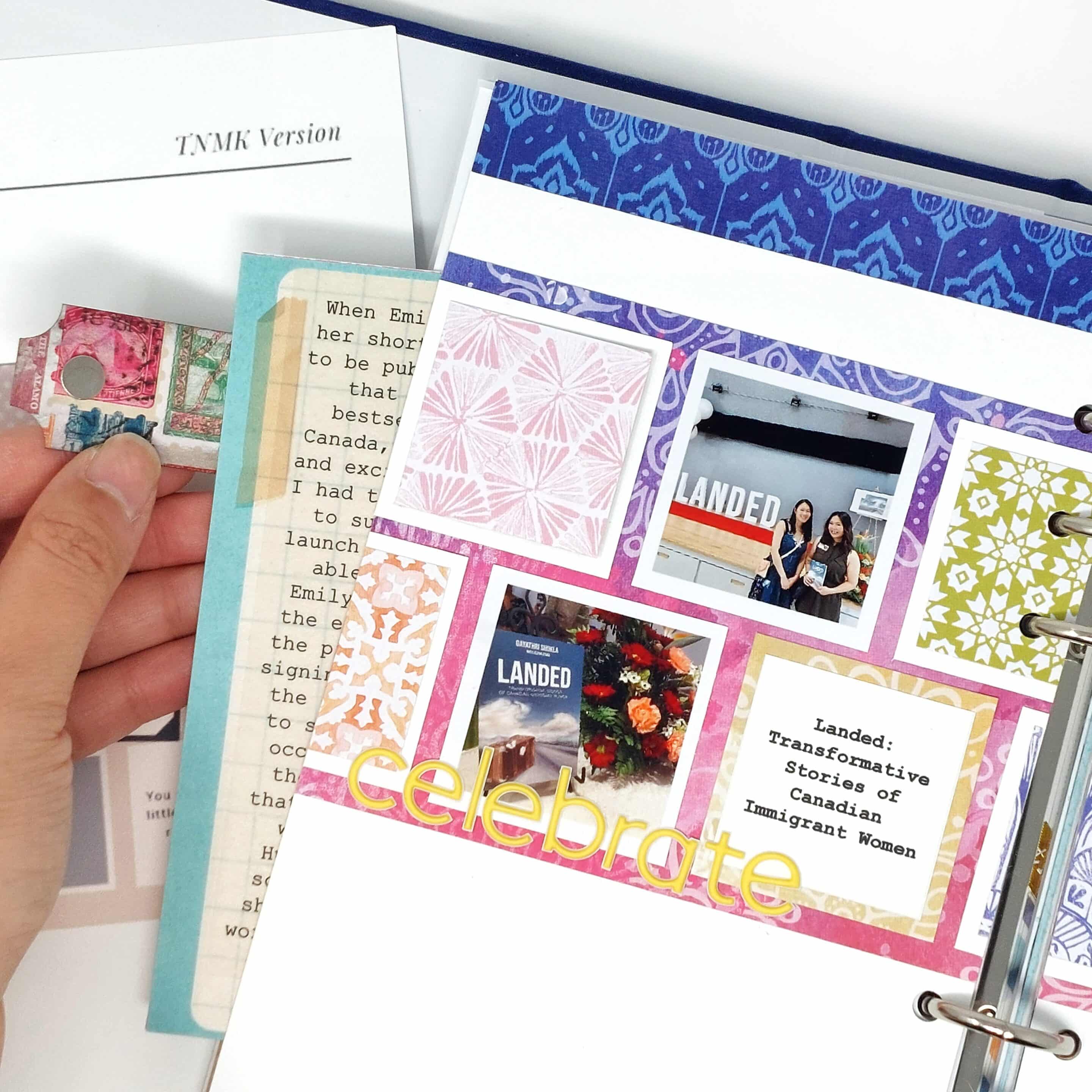My second interactive element involves a swivel closure that turns to allow two photo flip-outs to open up, revealing a total of 8 hidden photos on this layout! To decorate my swivel closure, I picked out the blue, pink, and purple adhesive-backed postage die-cut pieces, as I felt like they would bring out the blue, pink, and purple theme I was going for in my layout. And for the grid section of my layout, I LOVED mixing and matching the different geometric patterns in the patterned papers for this kit! I felt like the geometric patterns went really well with the tile-like grid design in the sketch!