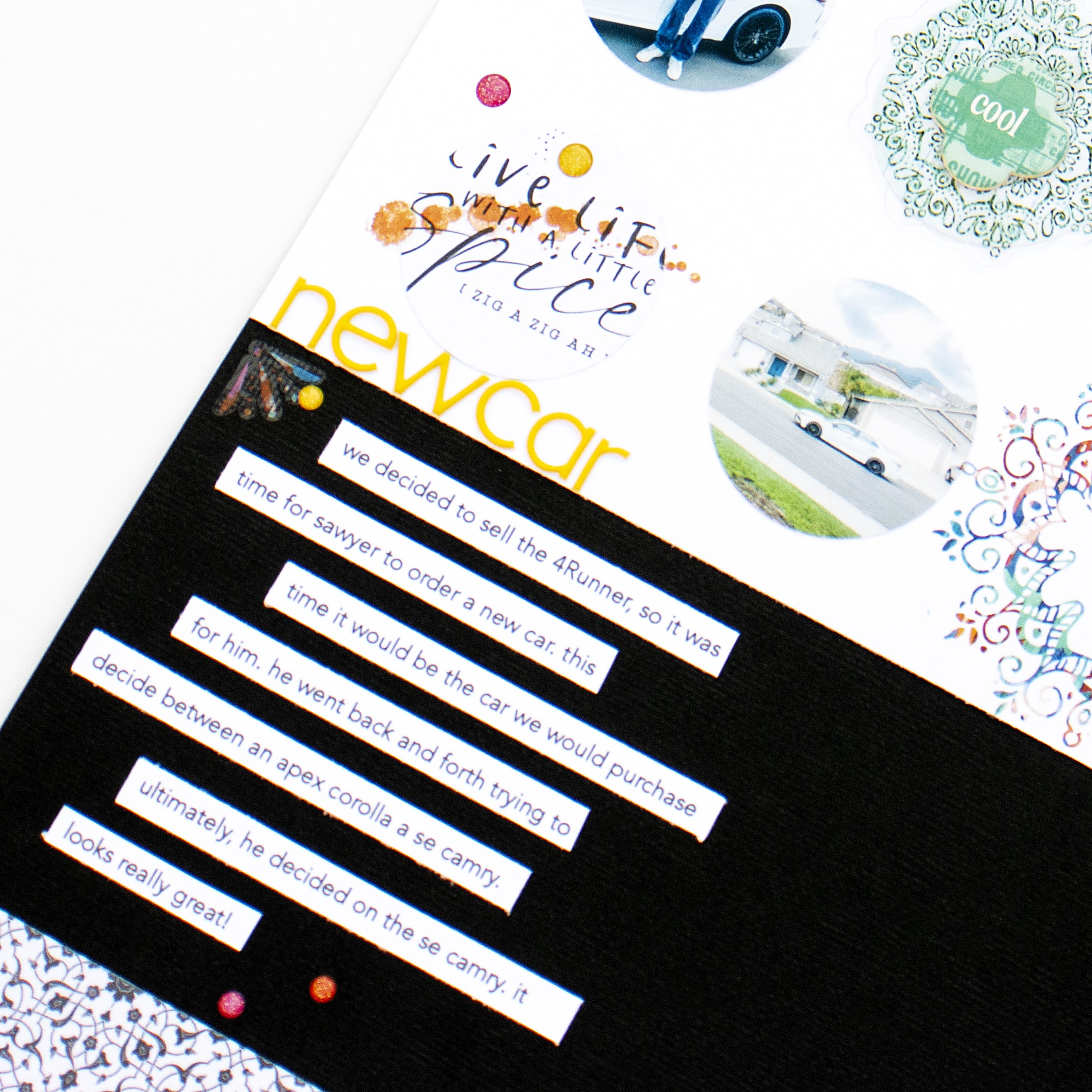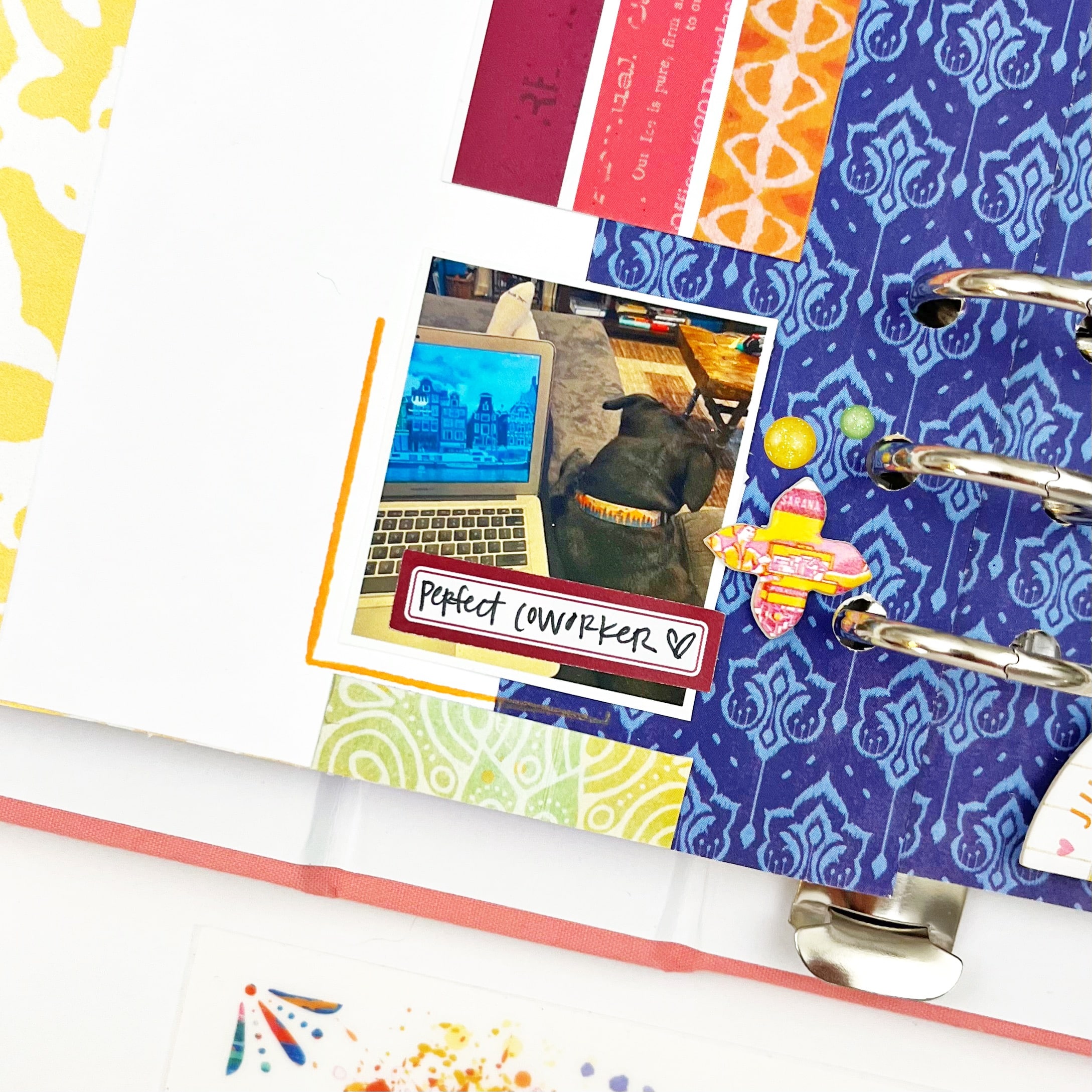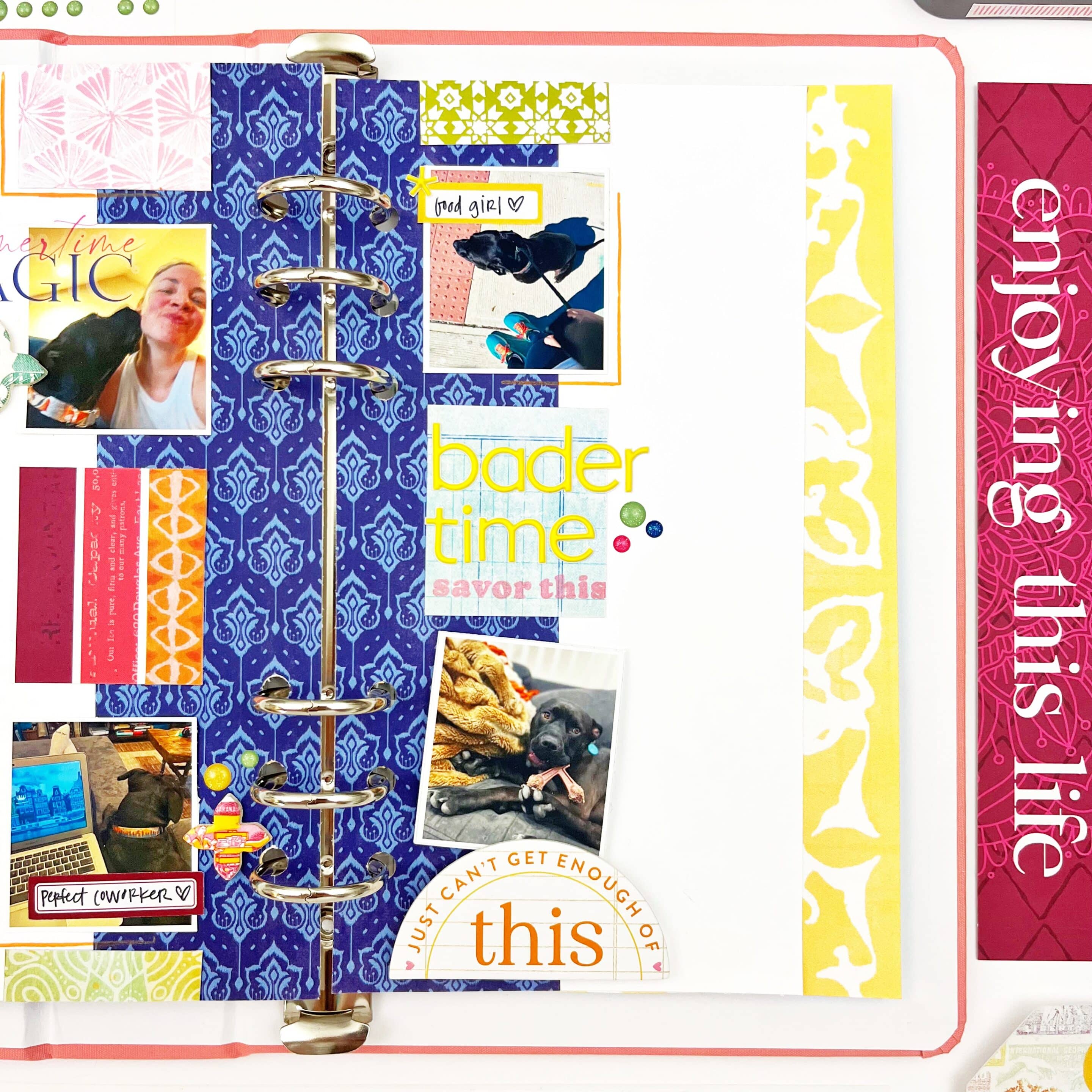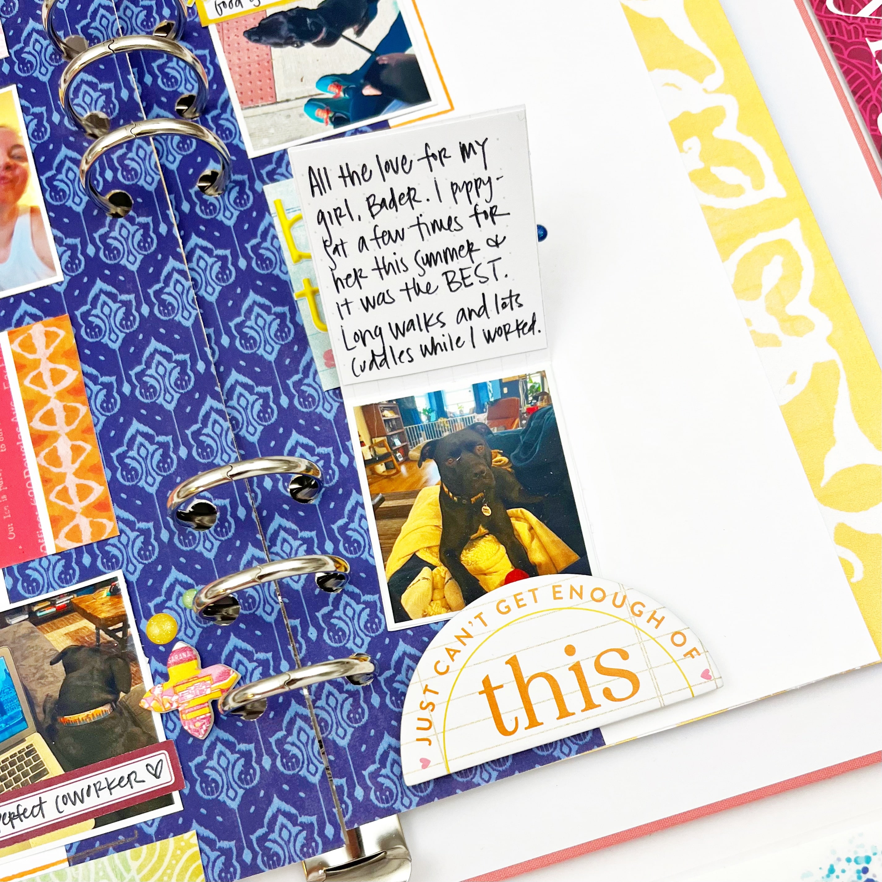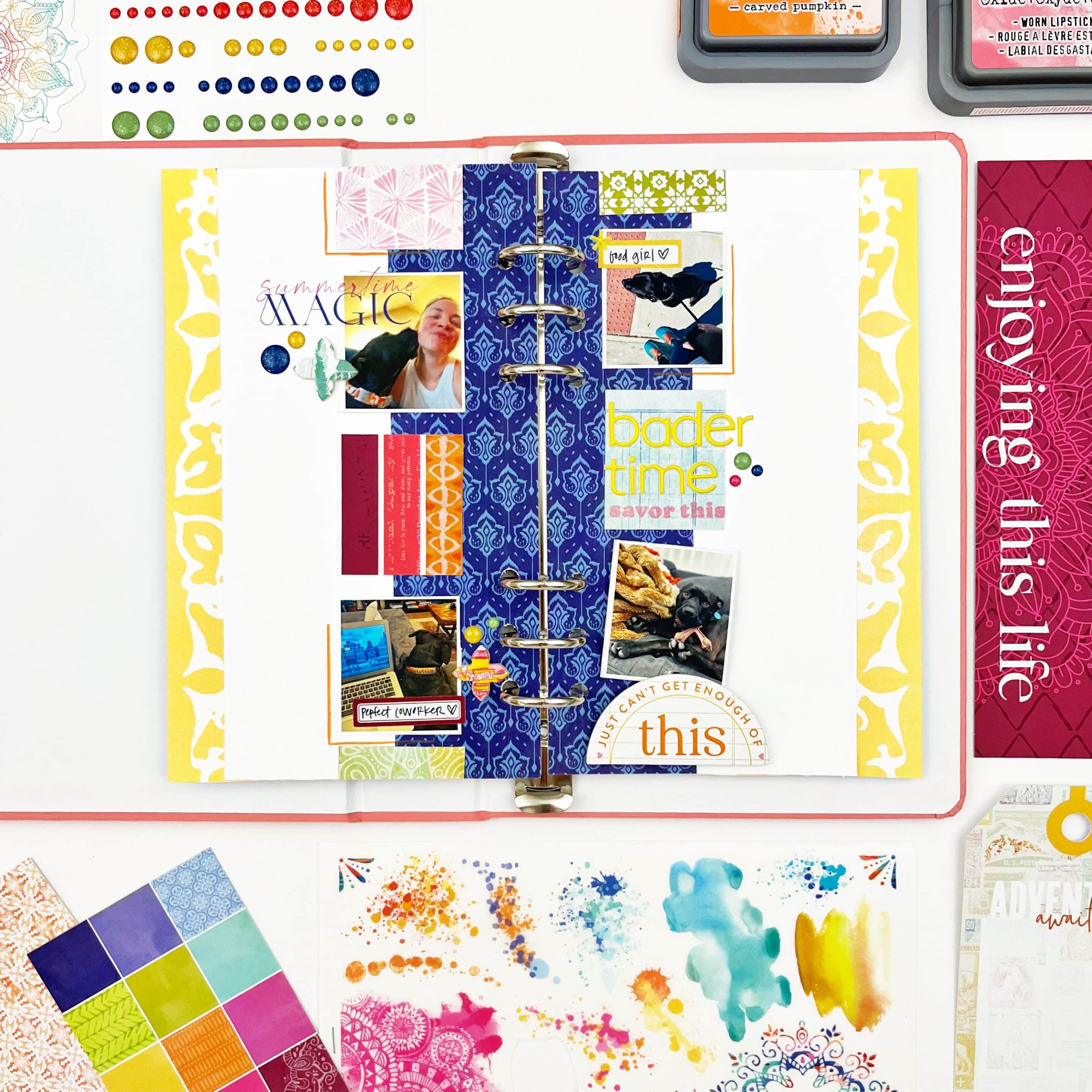 I used the large chipboard piece as a closure for a photo flip. The sentiment perfectly captures how I feel about one of my favorite pups! To make the flip, I used a blank page from the Spice MarketSimple Dori as the base. I like using this paper because it is thick enough to hold the interactive element and makes it easy to add hidden journaling on the inside. The flip is secured under the chipboard piece, which I adhered using foam adhesive on the bottom half of the half circle.