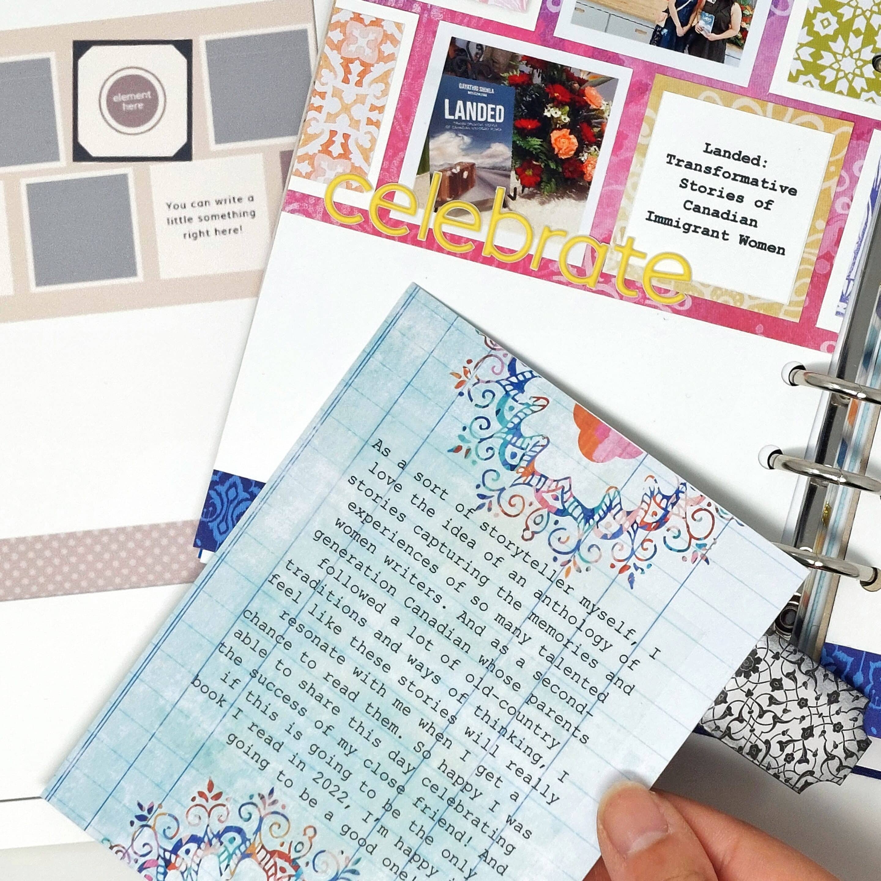 The first interactive element that I included in my layout was a hidden pocket behind the white cardstock portion of the sketch. I used the 6×8 patterned paper from the Spice Market Traveler’s Notebook Memory Keeping Kit to create a ticket stub-shaped magnetic closure, which flips open and pulls out to reveal some hidden journaling! The TN pocket card from the kit was the perfect size to hold my journaling once I trimmed the top and bottom parts down, and I loved that the sentiment “Explore your world” is generic enough to allow me to document a non-travel-related layout.