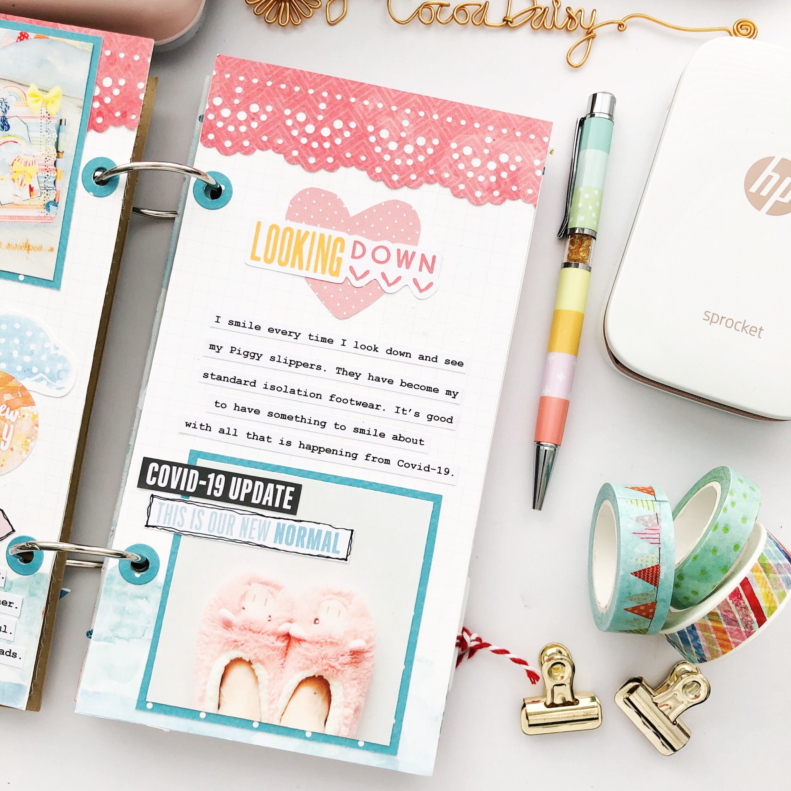 This is one of my all-time favourite prompts to use for the variety of ways it can be interpreted. It could be looking down from a mountain view or maybe looking down the path at a local park. With the lockdown measures around the world, I have used this prompt documenting looking down at my standard isolation footwear. ‘Piggy slippers’. The free COVID 19 Printable or Simon COVID 19 Printable from the Cocoa Daisy store are perfect documenting companions for this page.