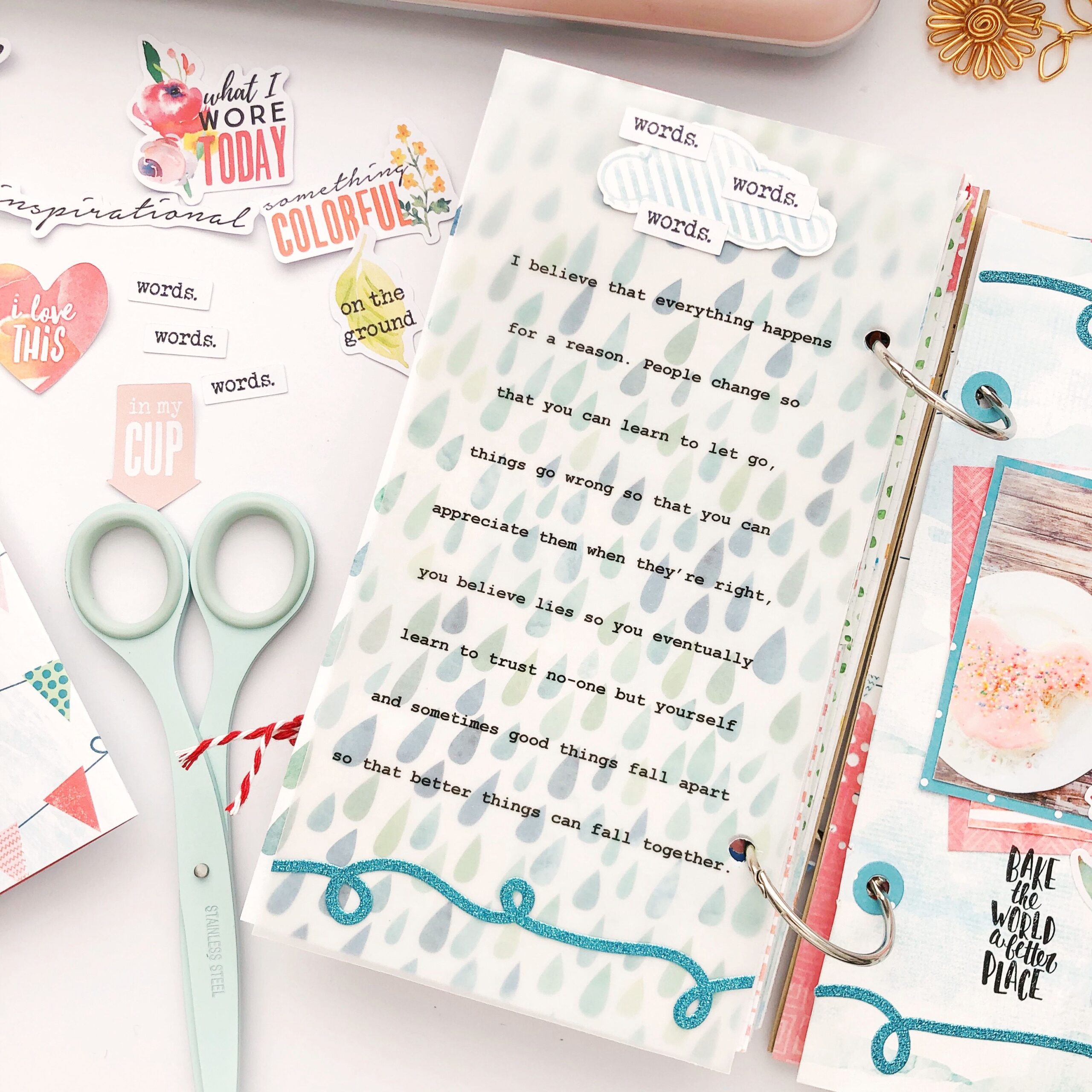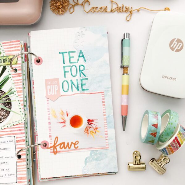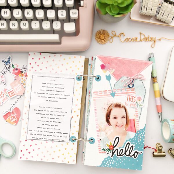 I love to read and document favorite quotes I find. It can be quite uplifting! I printed a lovely quote I read recently on some vellum with some of the Cocoa Daisy exclusive paper as an underlay. If quotes aren’t your scene perhaps your little one did a drawing for you with an explanation you wish to capture. Perhaps it’s a book you have been reading and can’t put down!