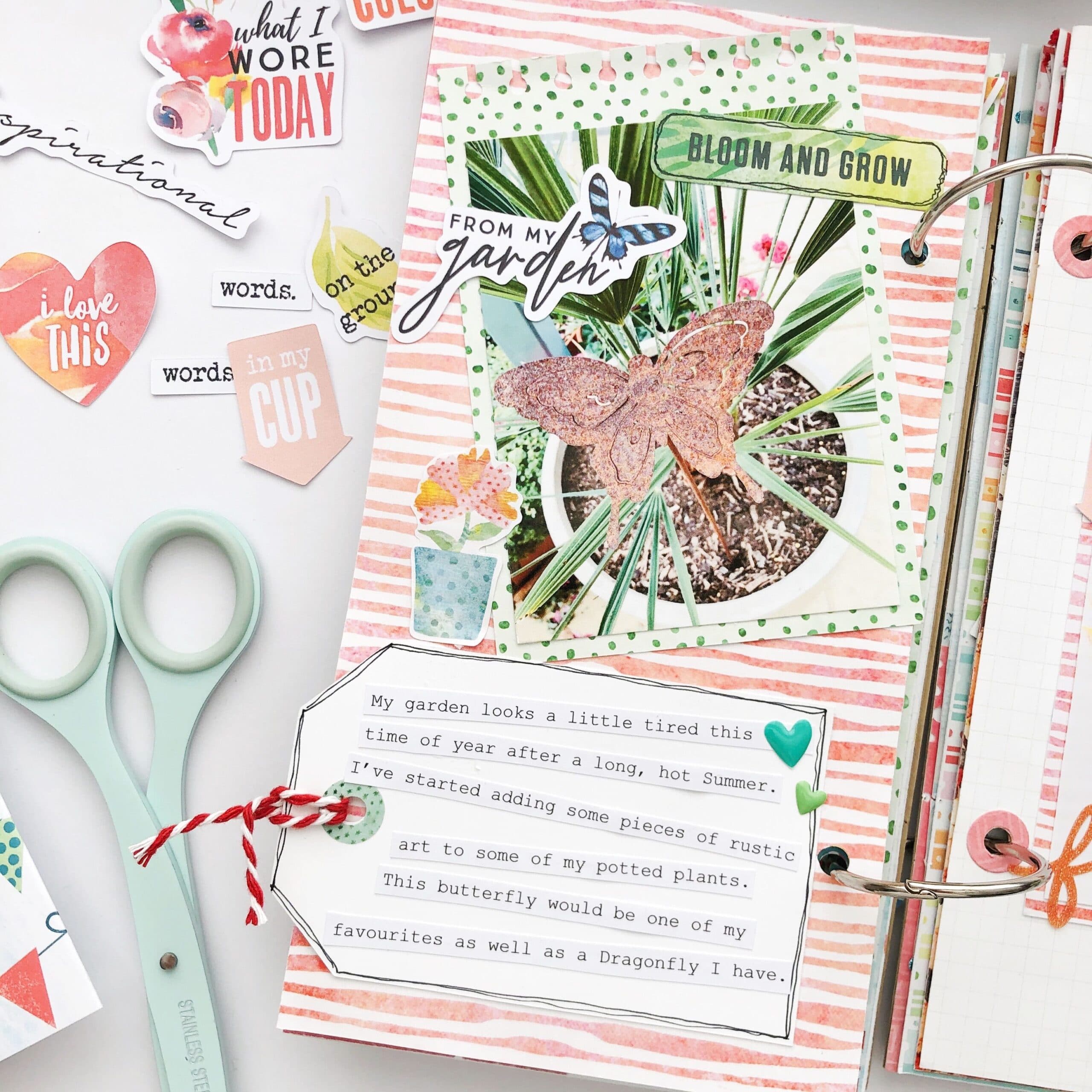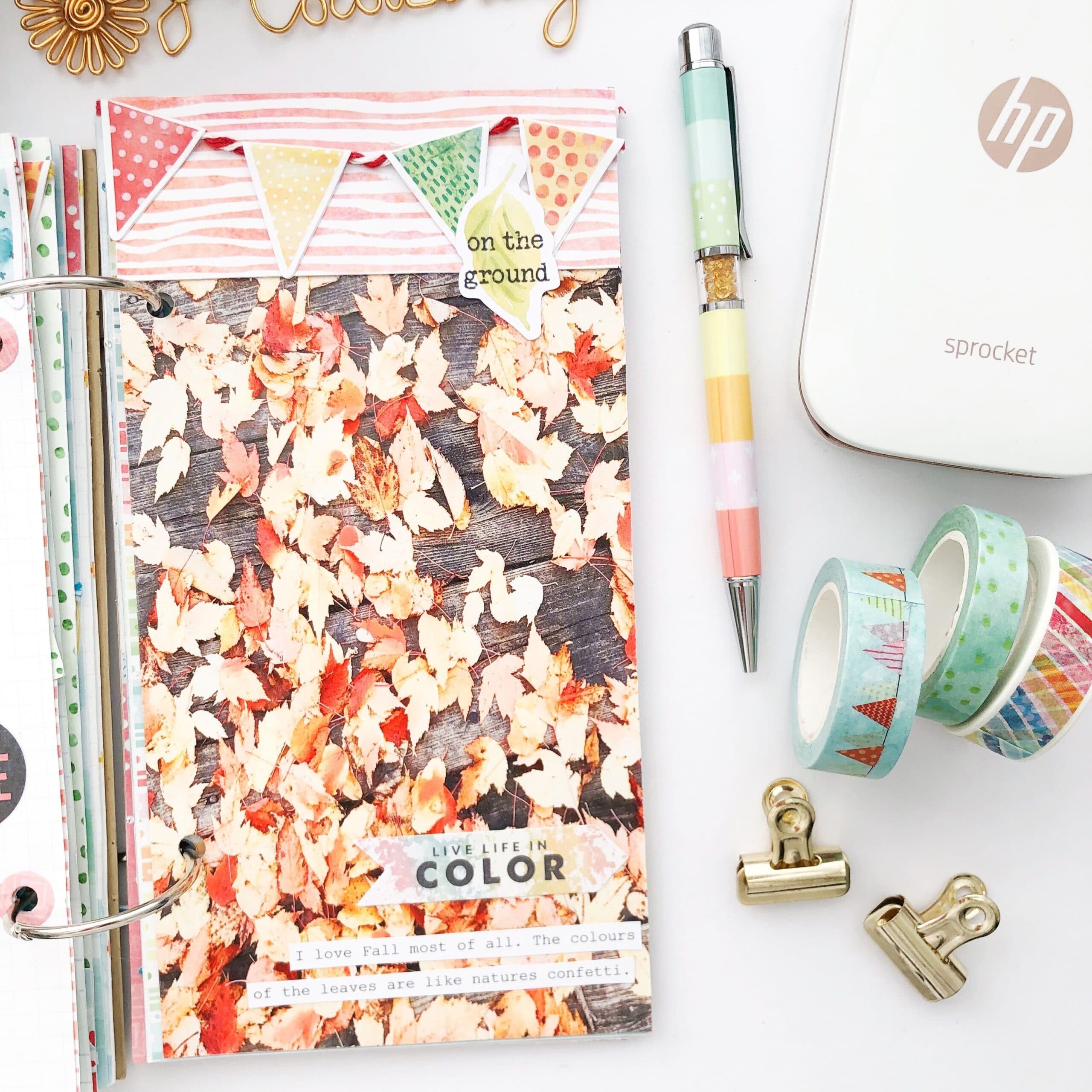 Since it’s Fall for me at the moment, I love documenting the changing of the leaves. I’ve printed a photo to the same size as a Dori page to capture nature’s confetti at my feet. Maybe you found some seashells at the beach or some Summer puddles to jump in.