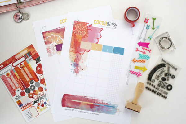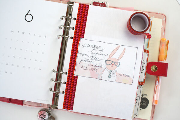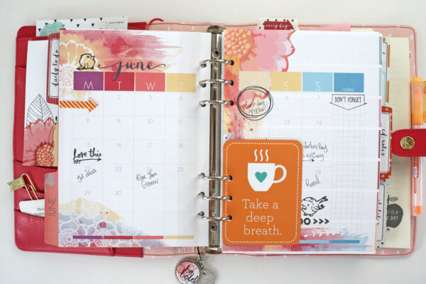 Once I have my dividers all done I start adding my planner pages. Every month we offer a free Month at a Glance printable that coordinates with our planner pages, so I print it off and dress it up with some washi tape, stickers and a few stamped images. [Ed. note: Month at a Glance is now printed in our pages, so we no longer include them in the printable.] I also inserted a journaling card (I like to add journaling cards throughout my planner. They are fun to flip through and add nice pops of color).