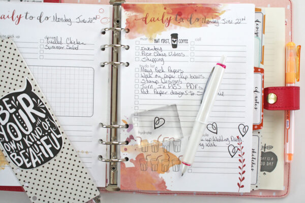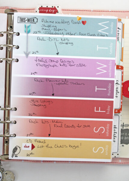 For my weekly planning I use the week at a glance and the daily pages, I rarely use the week in review pages since I like to have A LOT of room to write out my daily planning and because it changes hour by hour – literally! I usually just write out my initial thoughts of what I need to do that week on the week at a glance and then plan the next day or two out on my daily pages. I do not decorate my pages with much, a few stickers and some stamping is about all I add to mine. But that is what I love about our planner pages, there is enough variety that it covers just about any way you like to plan!