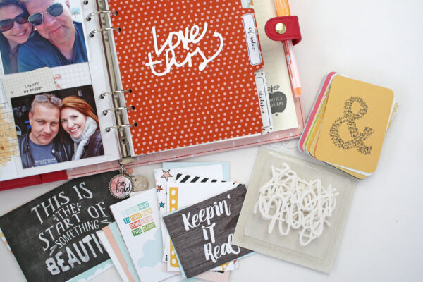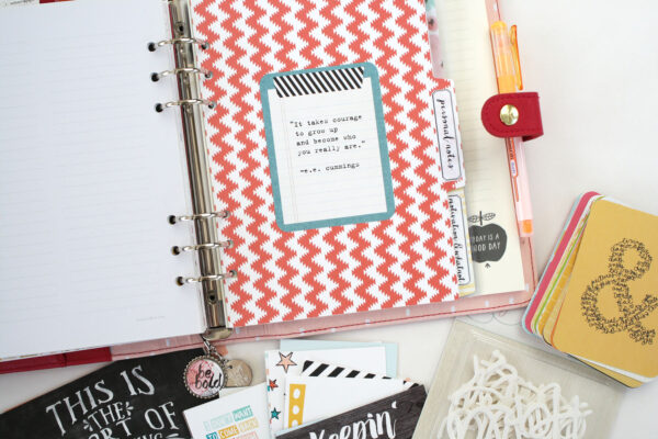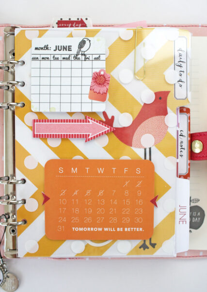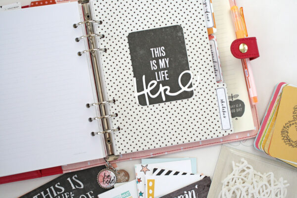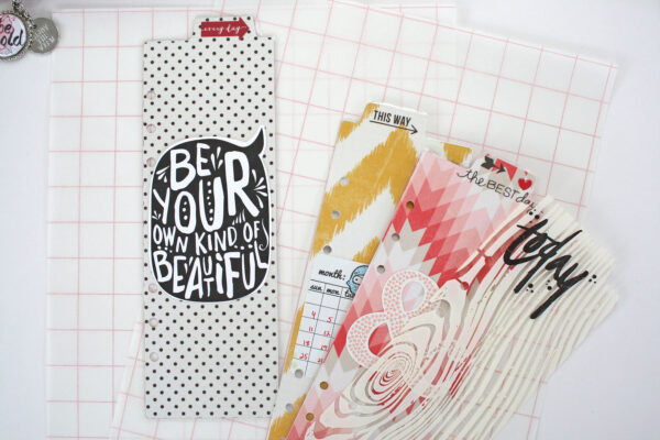 Along with the patterned paper divider pages I added a clear acrylic tab or “dashboard” to hold an assortment of post it notes and a fun little planner card.