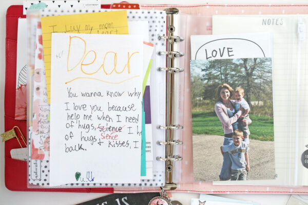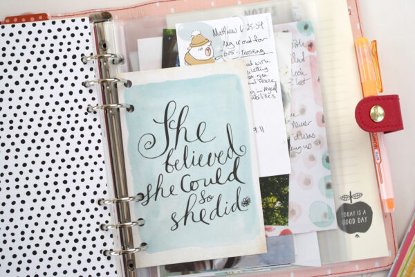 The last thing I keep in my planner, and frankly I think the most important section is my inspiration and motivation section. I keep my goals, my personal thoughts, ideas and the things that remind me of what is truly important. I have a couple clear pockets to hold pictures (I love this picture of my boys when they were just little guys), verses and love notes from my boys and Jeffrey. When the crazy chaos gets to me I just flip to this section, take a deep breath, and know it’ll all get done!