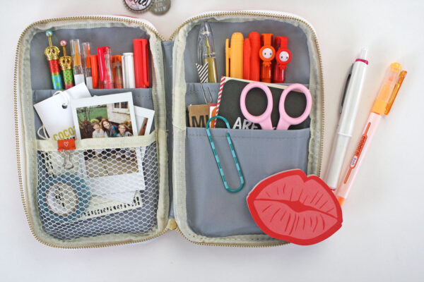Here is a little peek at what I put in my pencil pouch. I add pens and highlighters that are part of the month’s color scheme, along with some note cards, washi tape, my little scissors, post its and of course a few pics.
