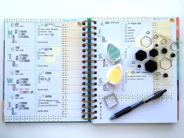 I get my inspiration from anywhere! I own so many planner stamping sets, I like to play around with each of them. I keep a separate notebook from MayDesigns and stamp out my ideas in there, note down my favorites, and stamp away in my planner. Also, a few of my top inspirations from Instagram: @livelifeandcreate, @plannerfriend, @paperedlove, @theresetgirl, @createwithbeth, @filoeyecandi, @filoally.