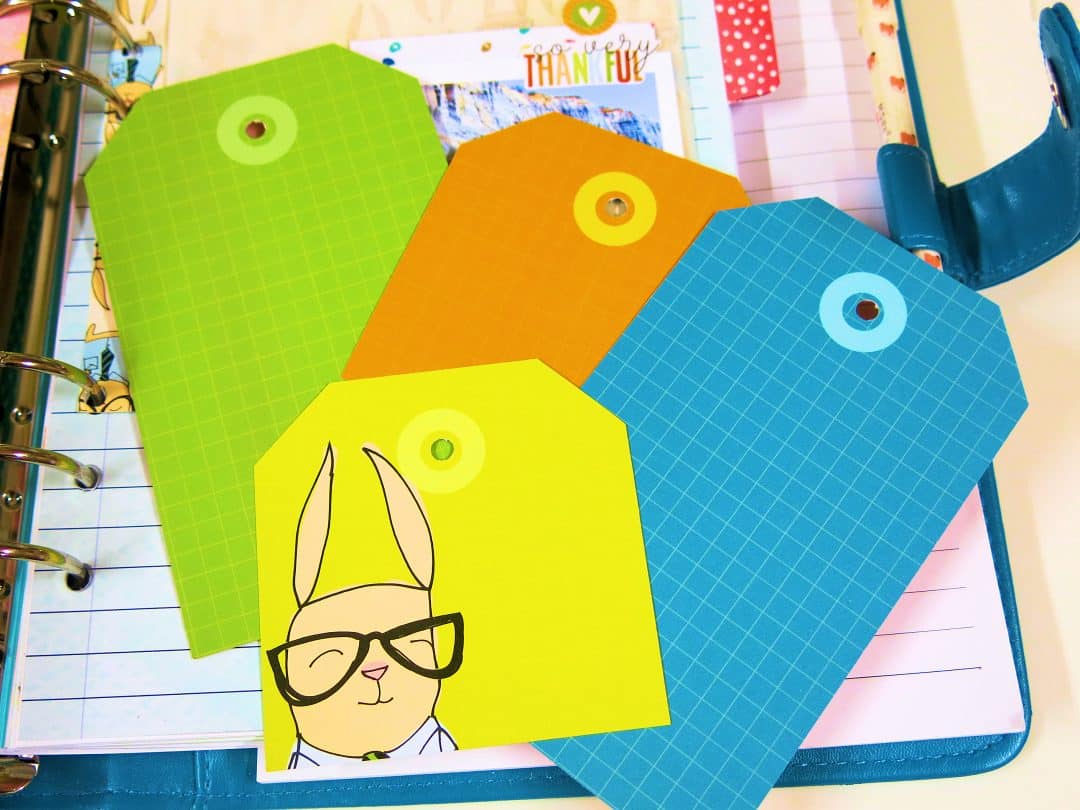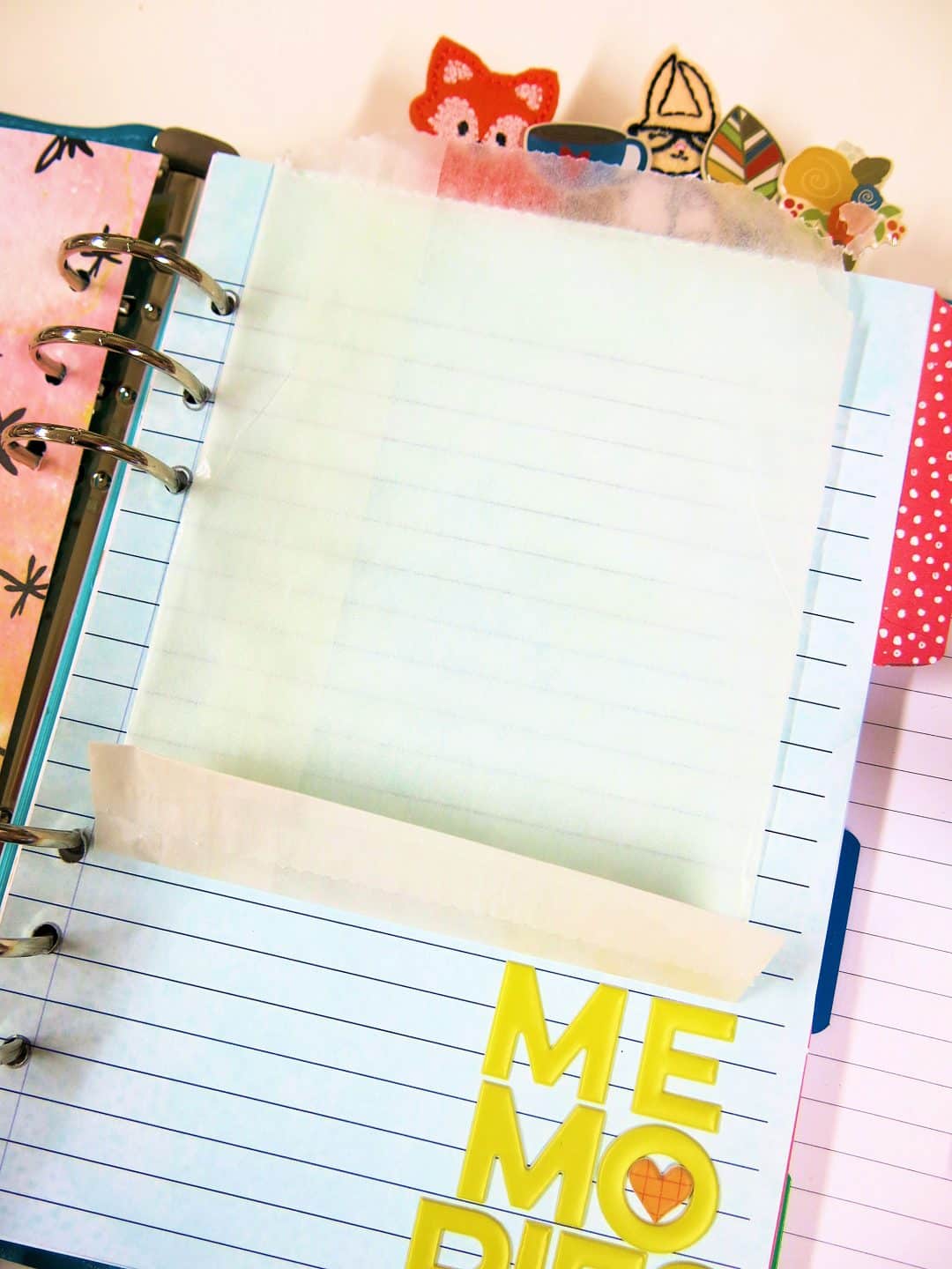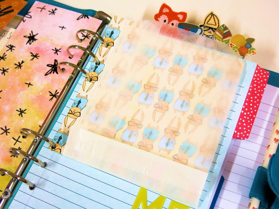 I cut some of the ‘Simon’ (bunny) paper to the same size as the envelope, only slightly wider. I matched it up with the holes of my planner and punched them out so they it could be added on top of my dashboard page. I stuck the glassine envelope to the Simon Paper. I now have my pocket page.