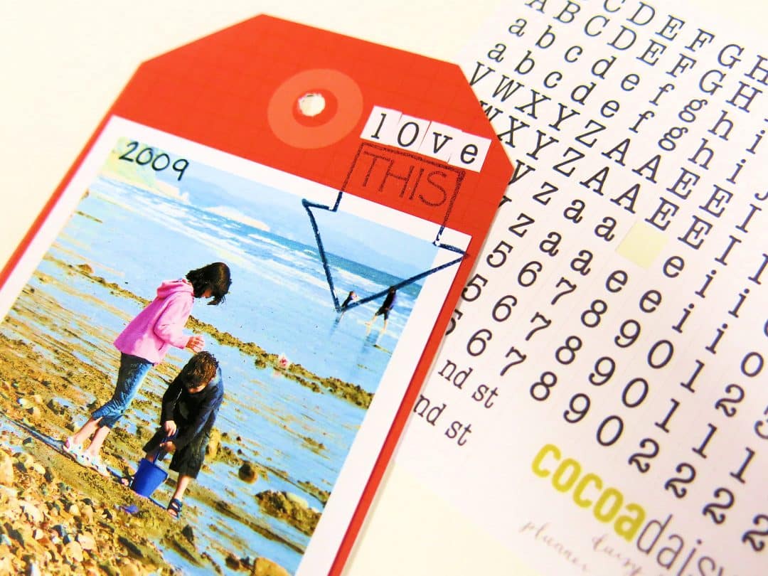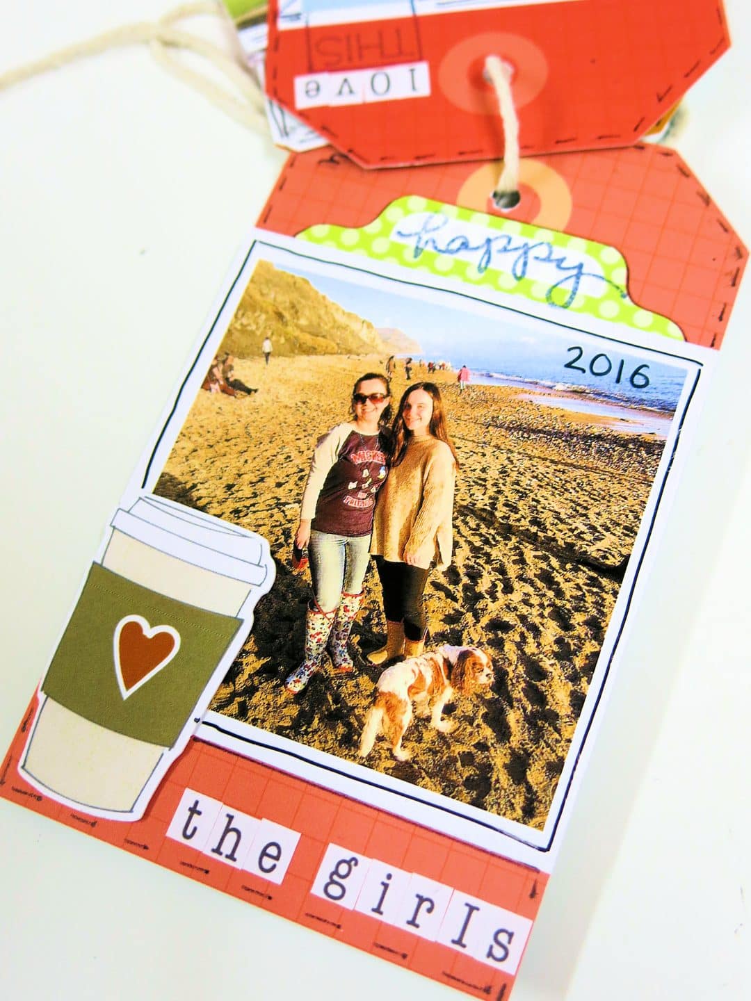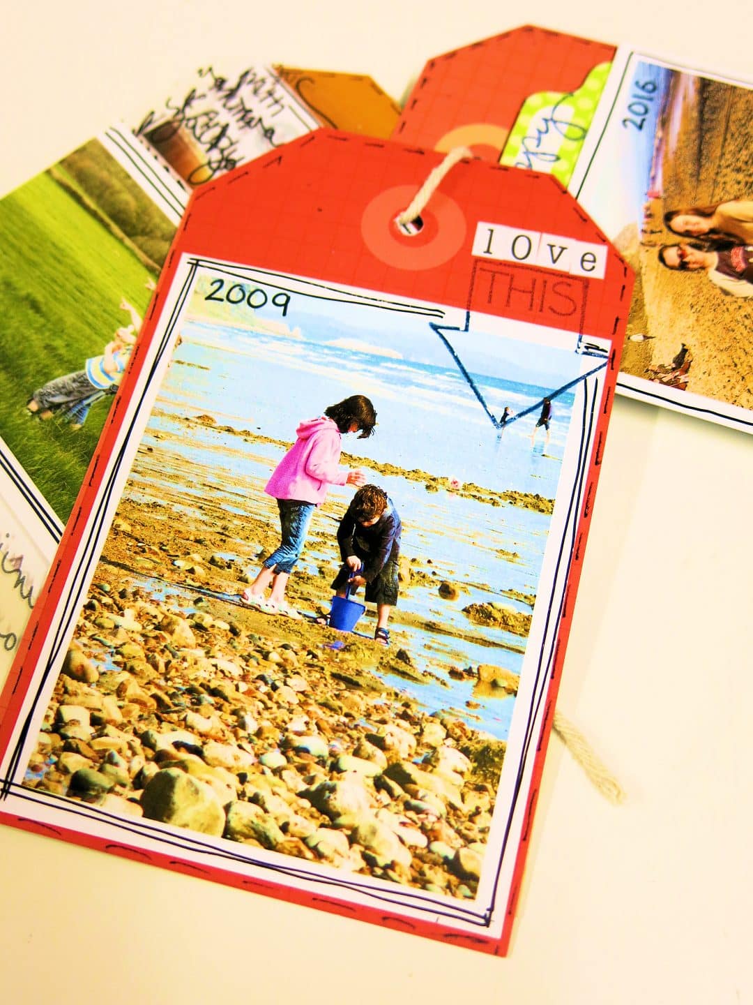 I used the same piece of 12×12 paper that I’d used before and cut a thin strip to size that was longer than both photos together and stuck this to the tag.