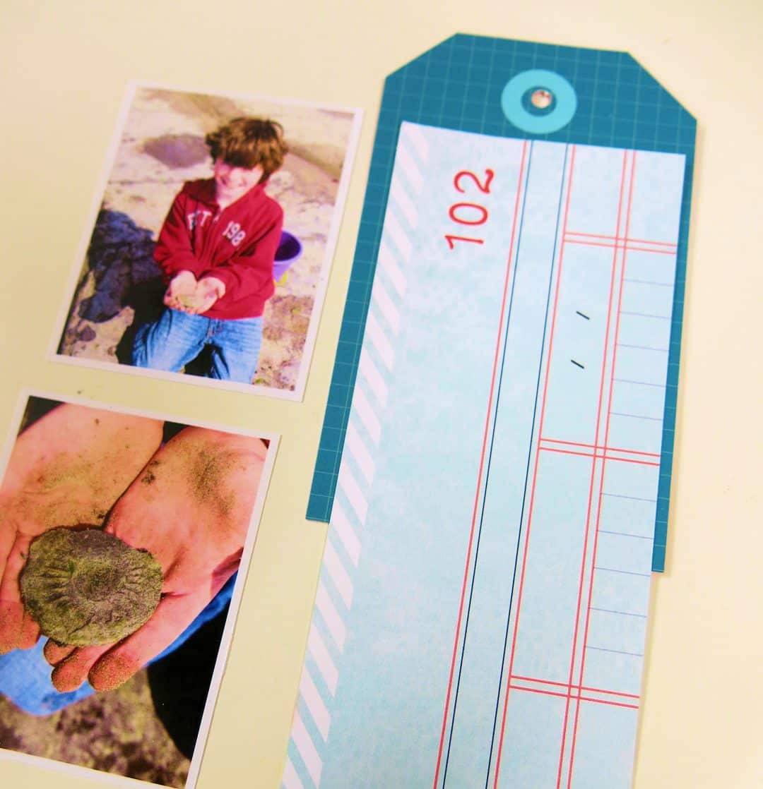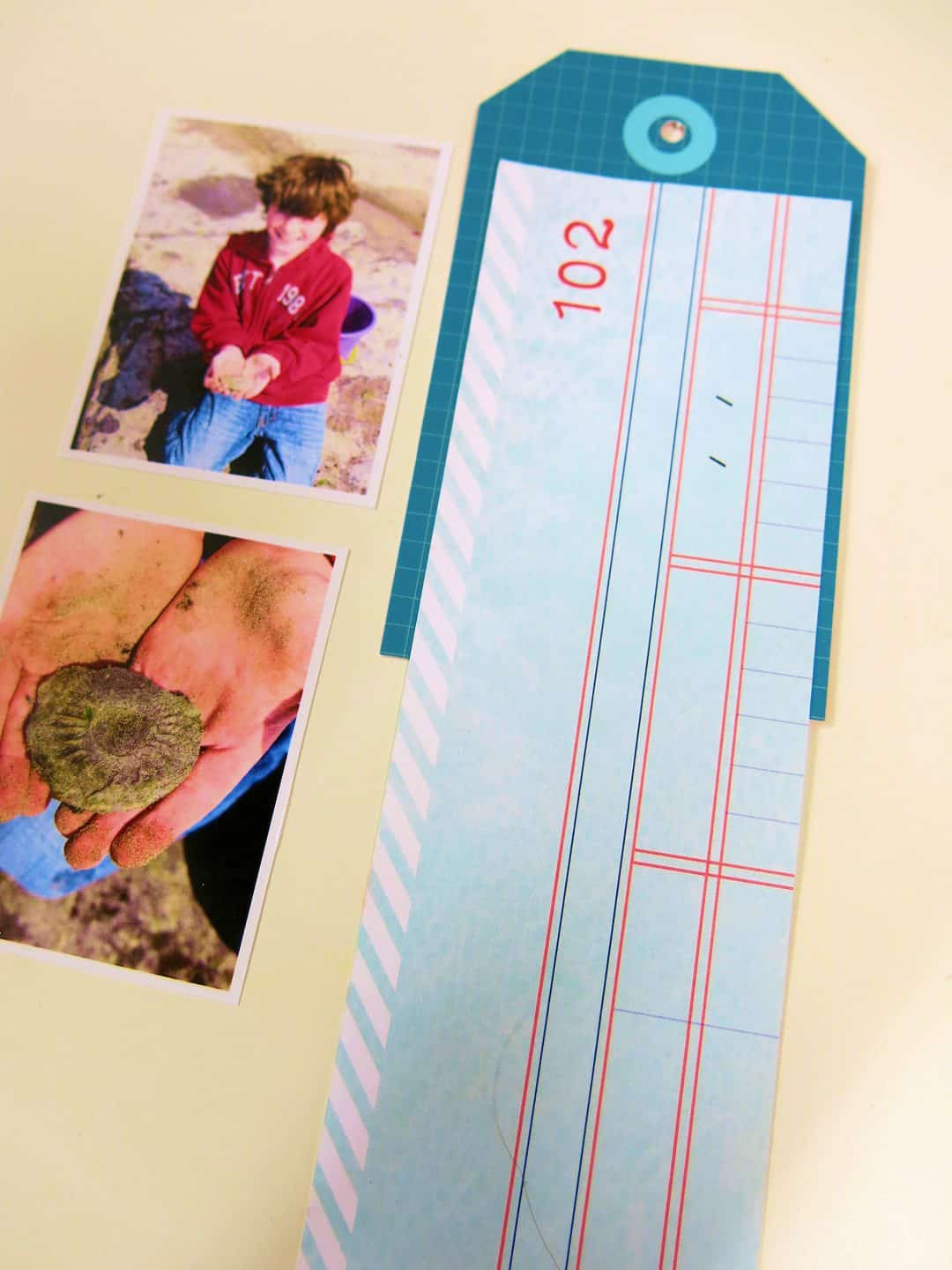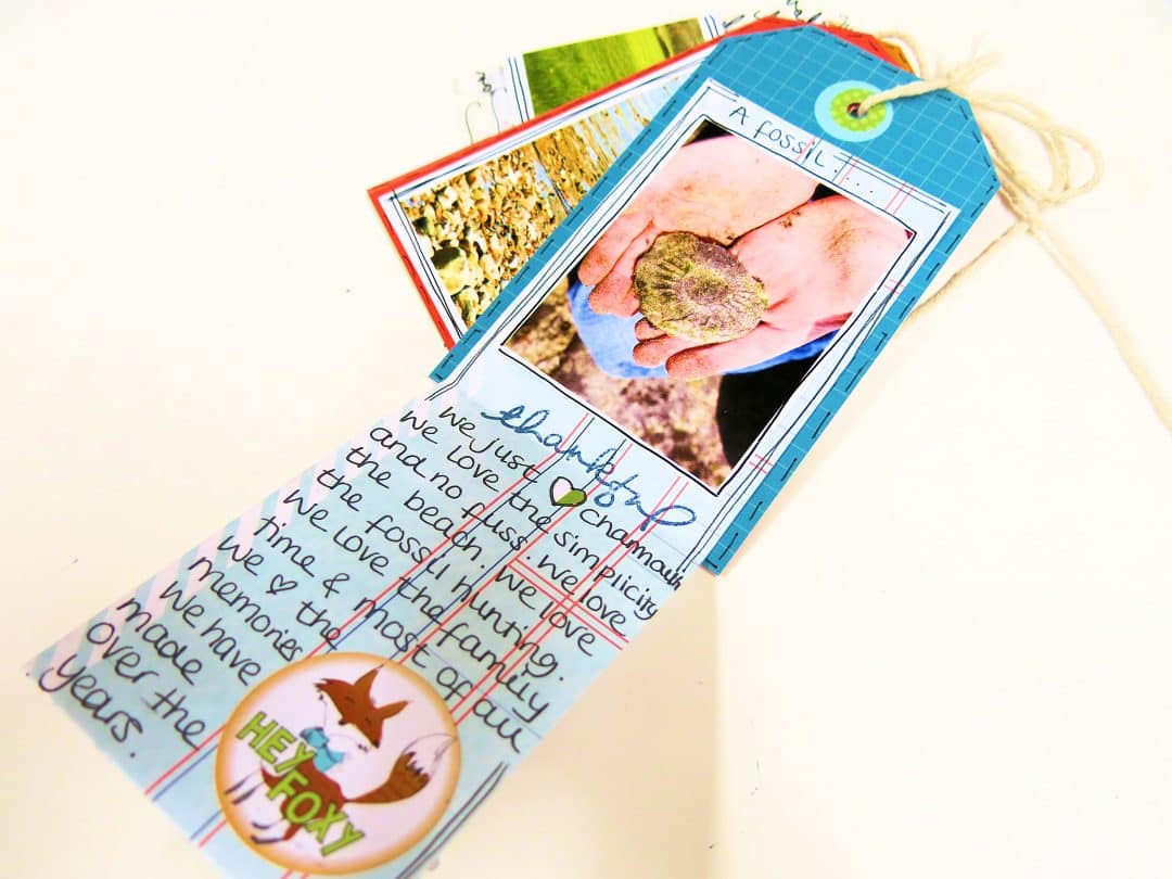For my last page of this mini book, I wanted to add these 2 photos. I wanted to have a close up of the fossil that my son had found when he was little. I created a piece that would fold out so that I could keep the photos together side by side, but this way the tag mini book could still keep it’s size. I added some double sided sticky to the tag.