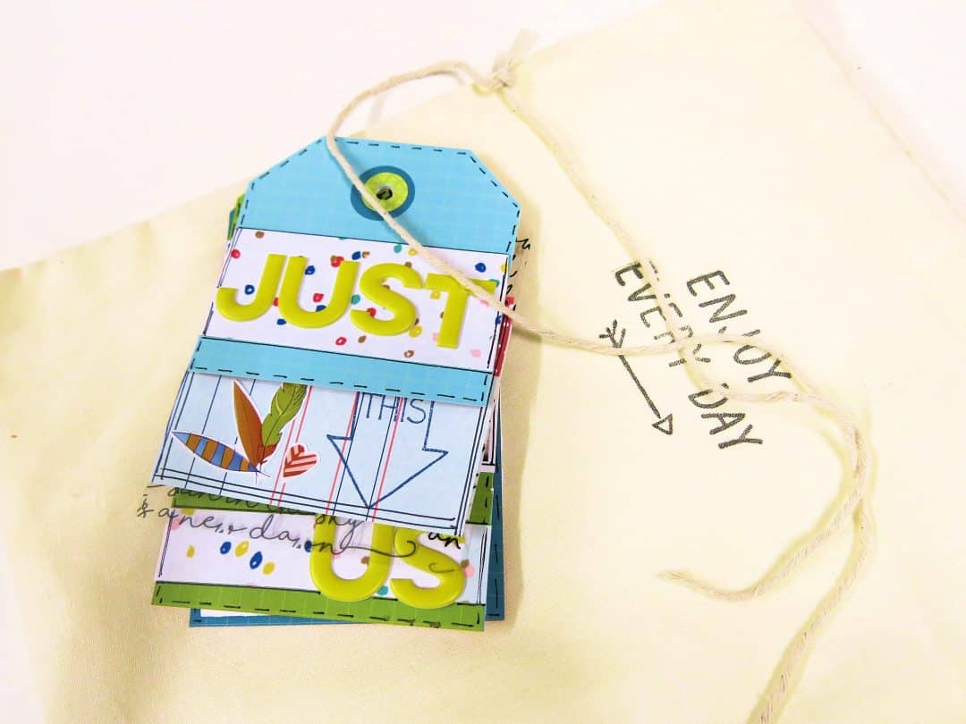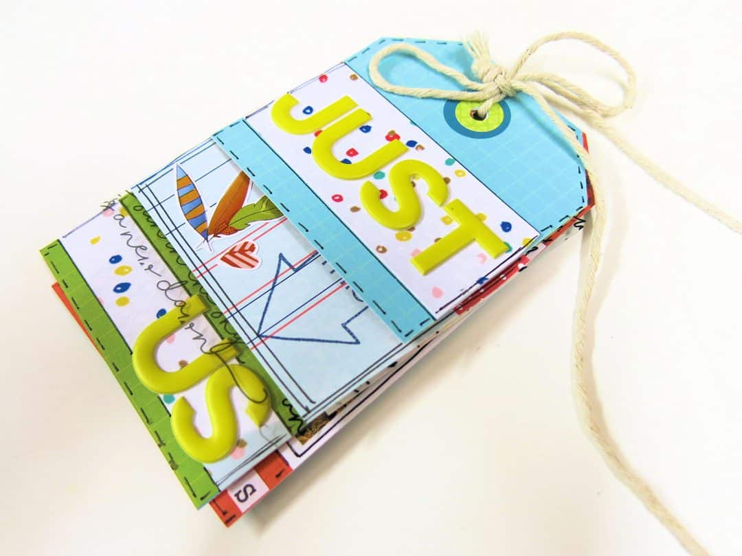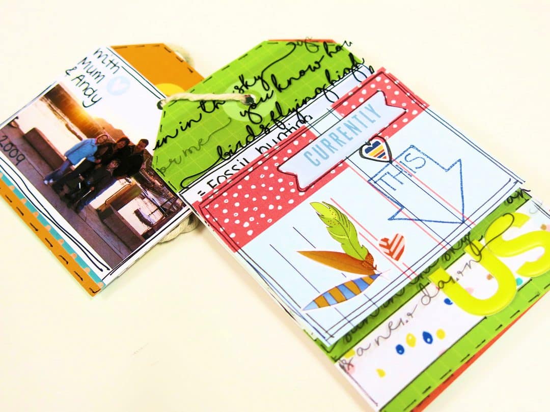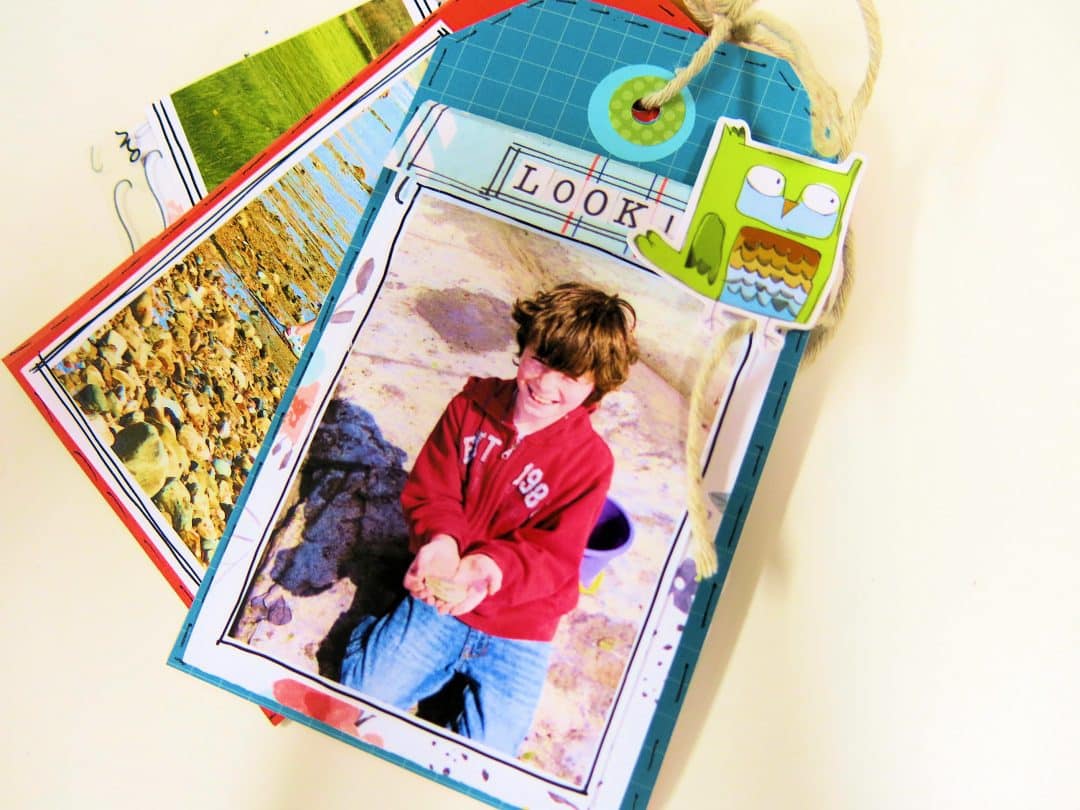For my last page of this mini book, I wanted to add these 2 photos. I wanted to have a close up of the fossil that my son had found when he was little. I created a piece that would fold out so that I could keep the photos together side by side, but this way the tag mini book could still keep it’s size. I added some double sided sticky to the tag.