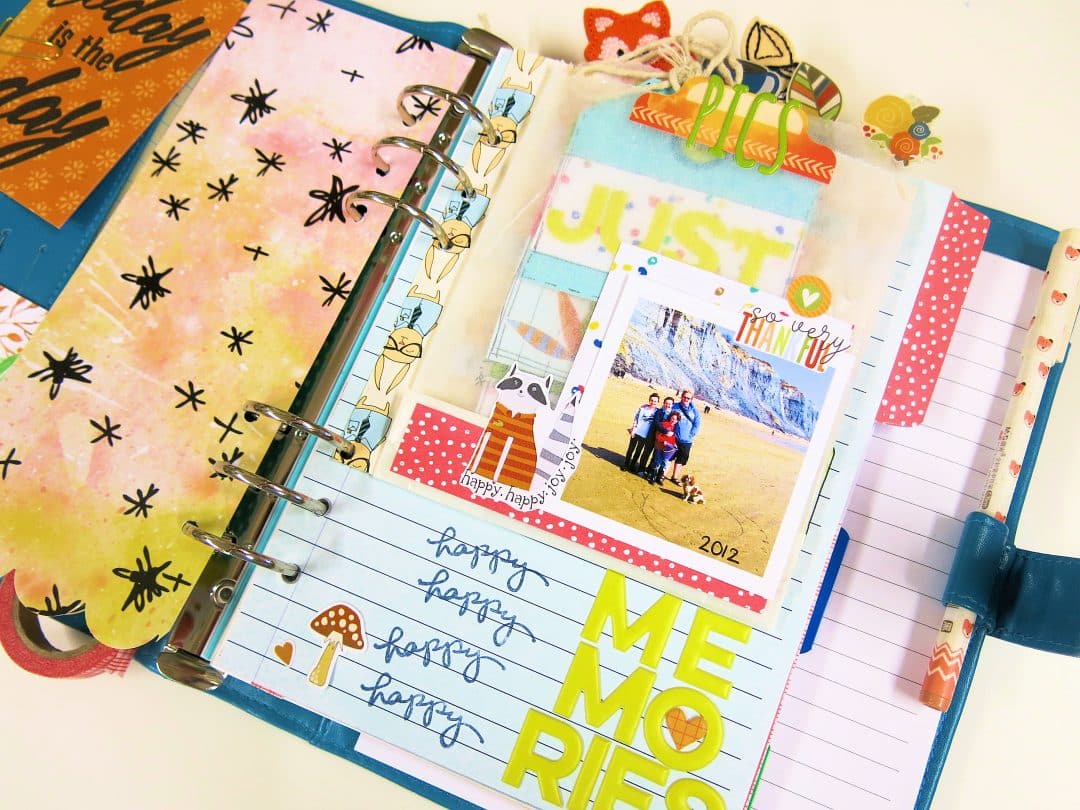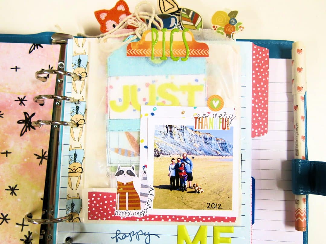 I decorated the glassine envelope a little with a photo, some scraps of the papers that I’d previously used and some of the planner stickers too, layering these up.