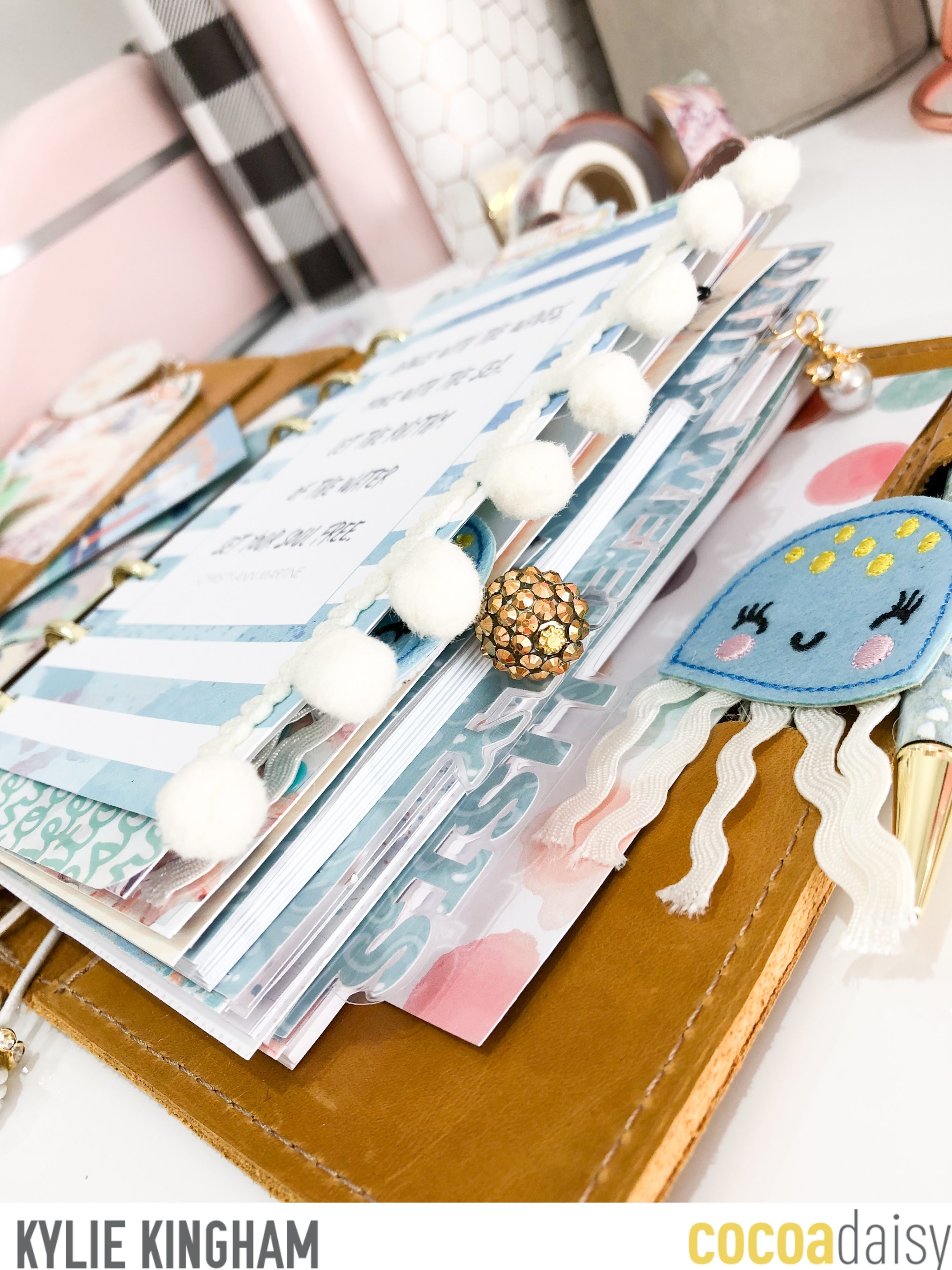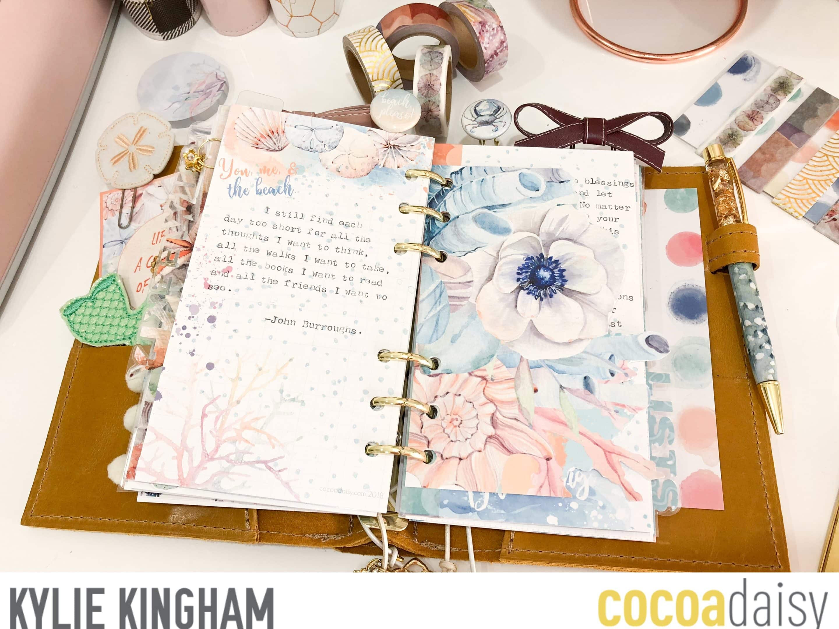 I had no trouble down sizing with my monthly pages.I actually felt my pages looked neater and perhaps made me more organised….Haha!….We shall see with that. I couldn’t resist using my Mermaid and Fishy stamps from a past Cocoa Daisy kit. They were some of my favourites after all.