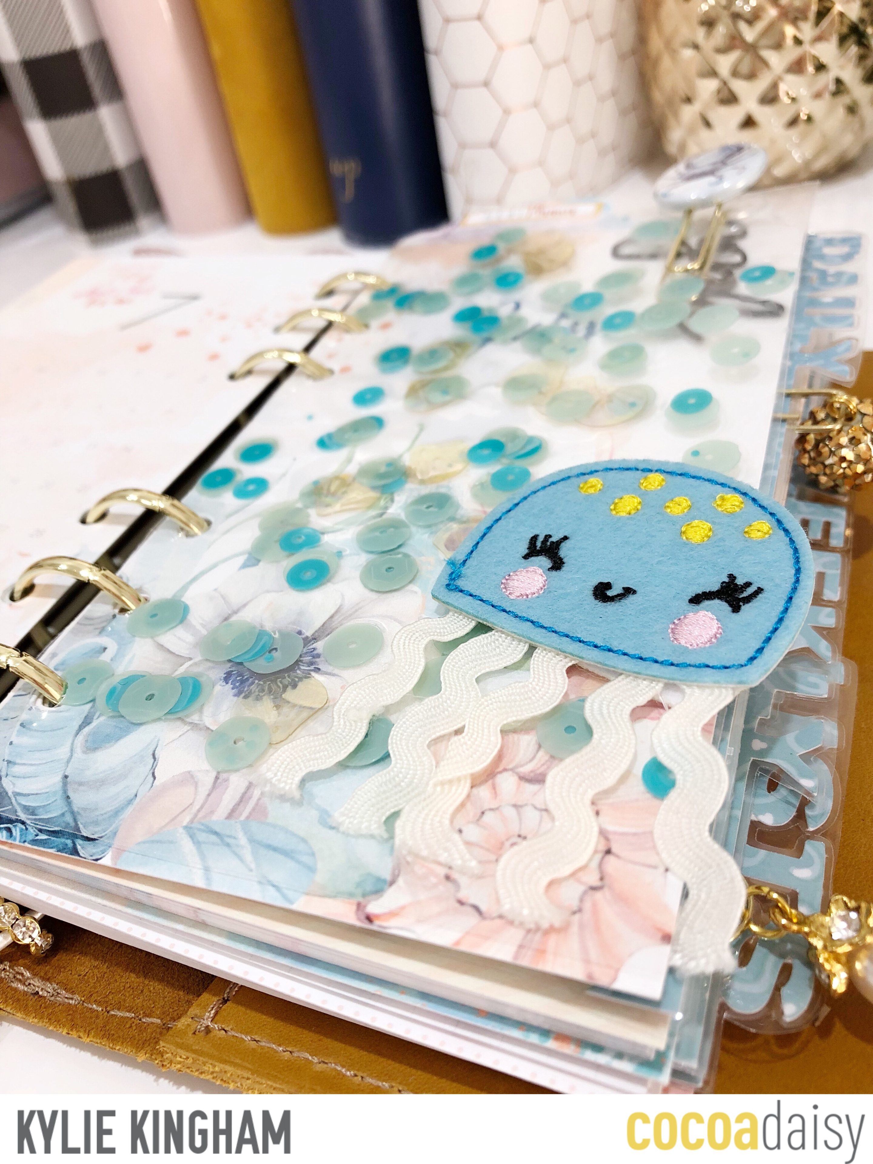 With some left over sequins from my June Memory Keeping kit I also made a dashboard with them sandwiched in between. It was the first time I had tried this and will definitely create more.I added the felt Jelly Fish to it as well.
