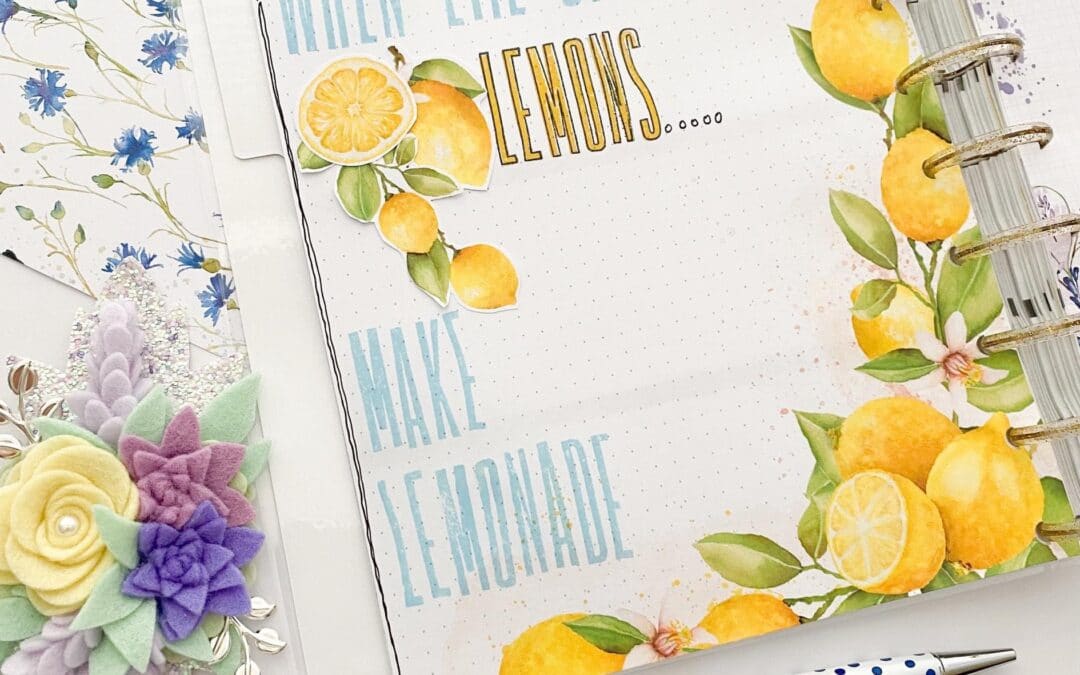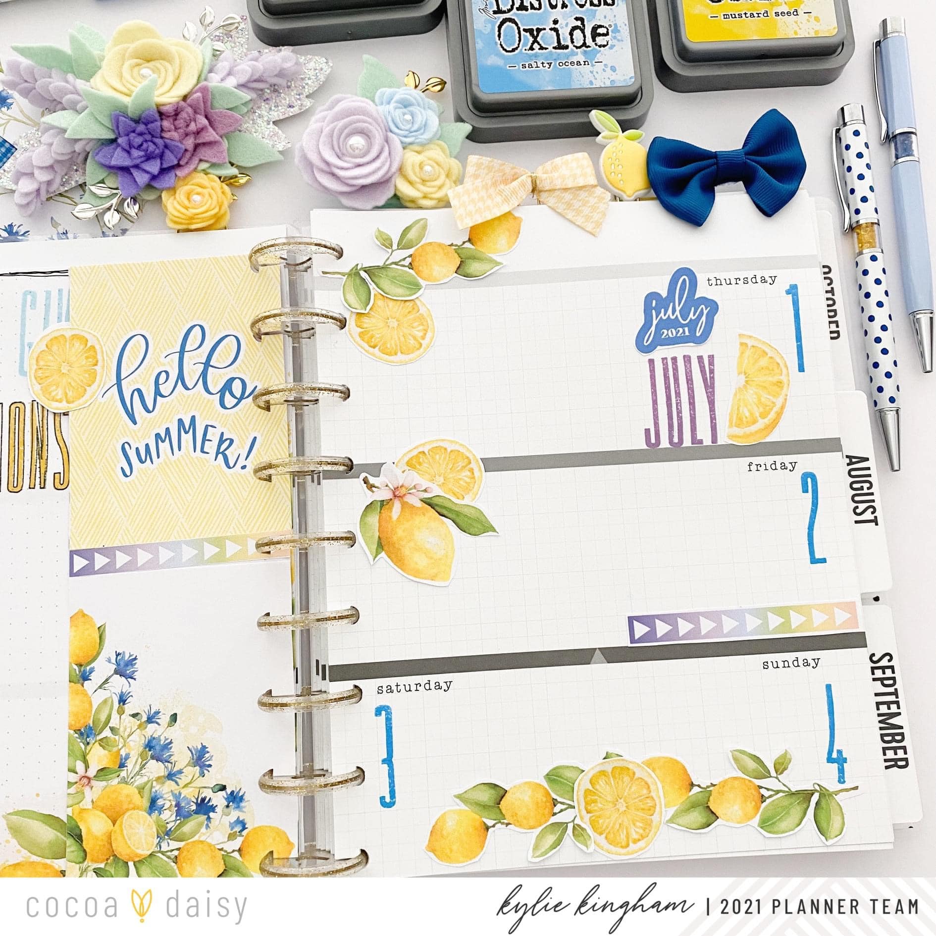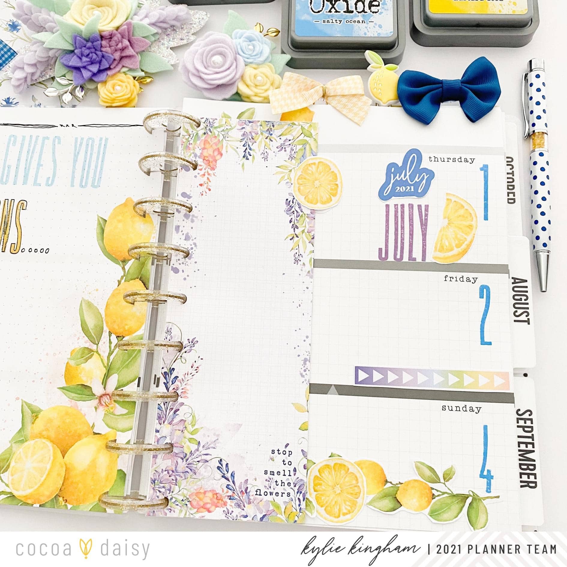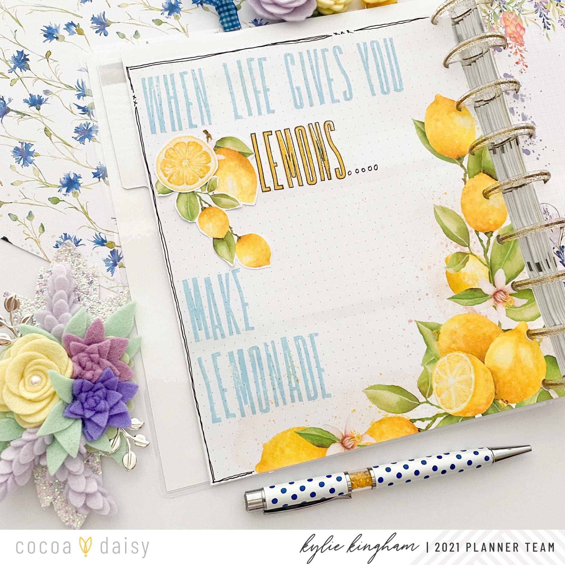 I trimmed one of the A5 decorative note pages to fit my planner before punching space for my discs. I couldn’t resist adding a fun quote with some of the Cocoa Daisy Alpha stamps which layer beautifully. I also fussy cut more lemons to add even more colour.