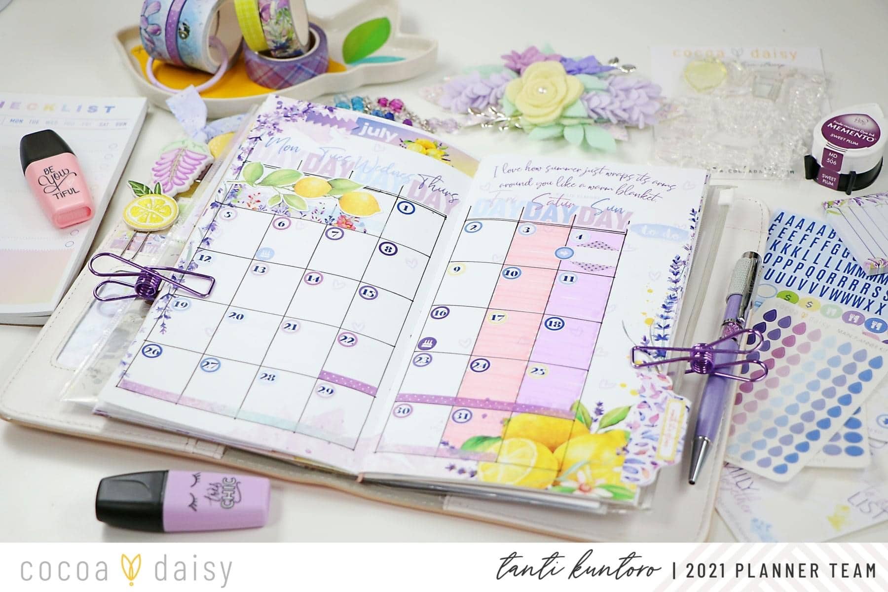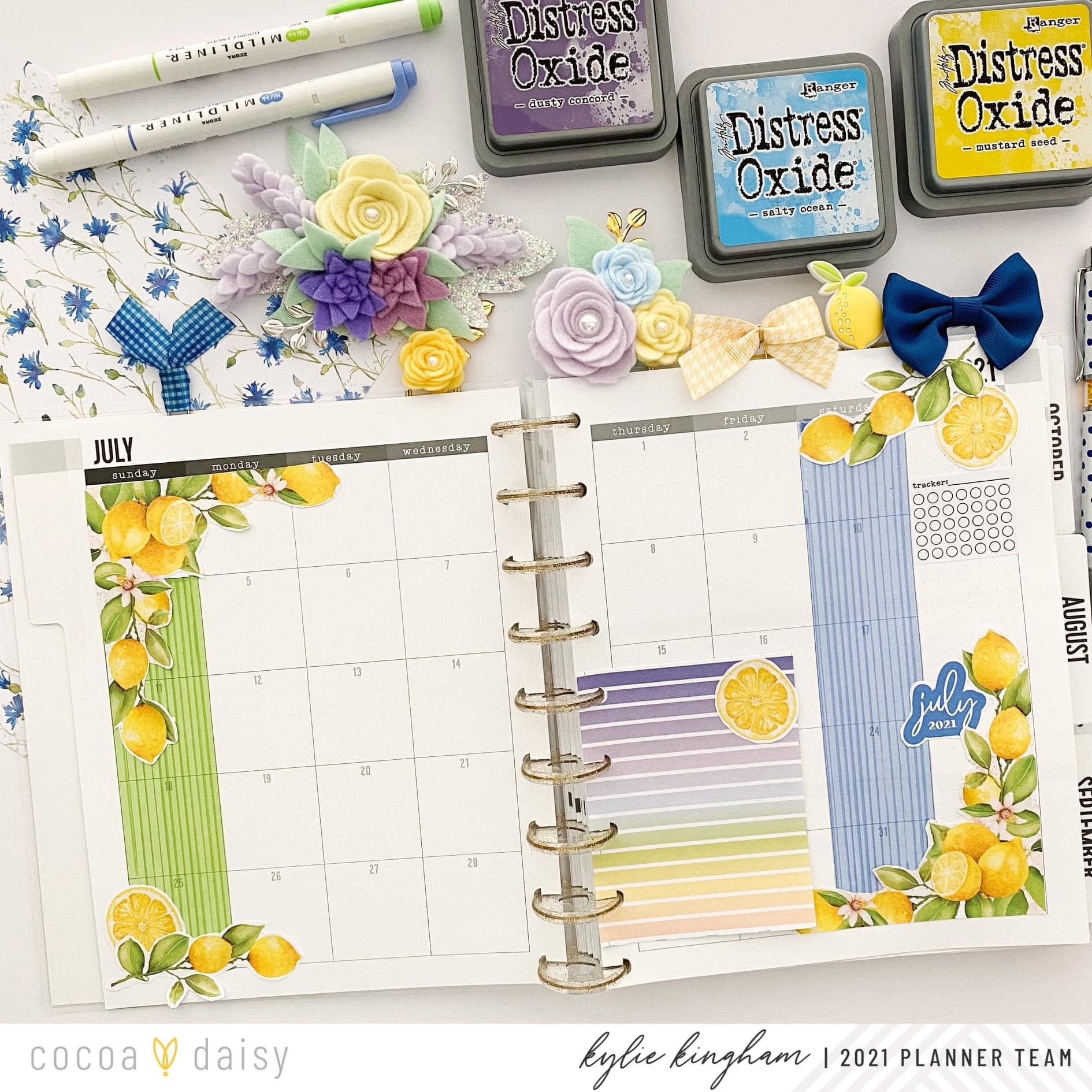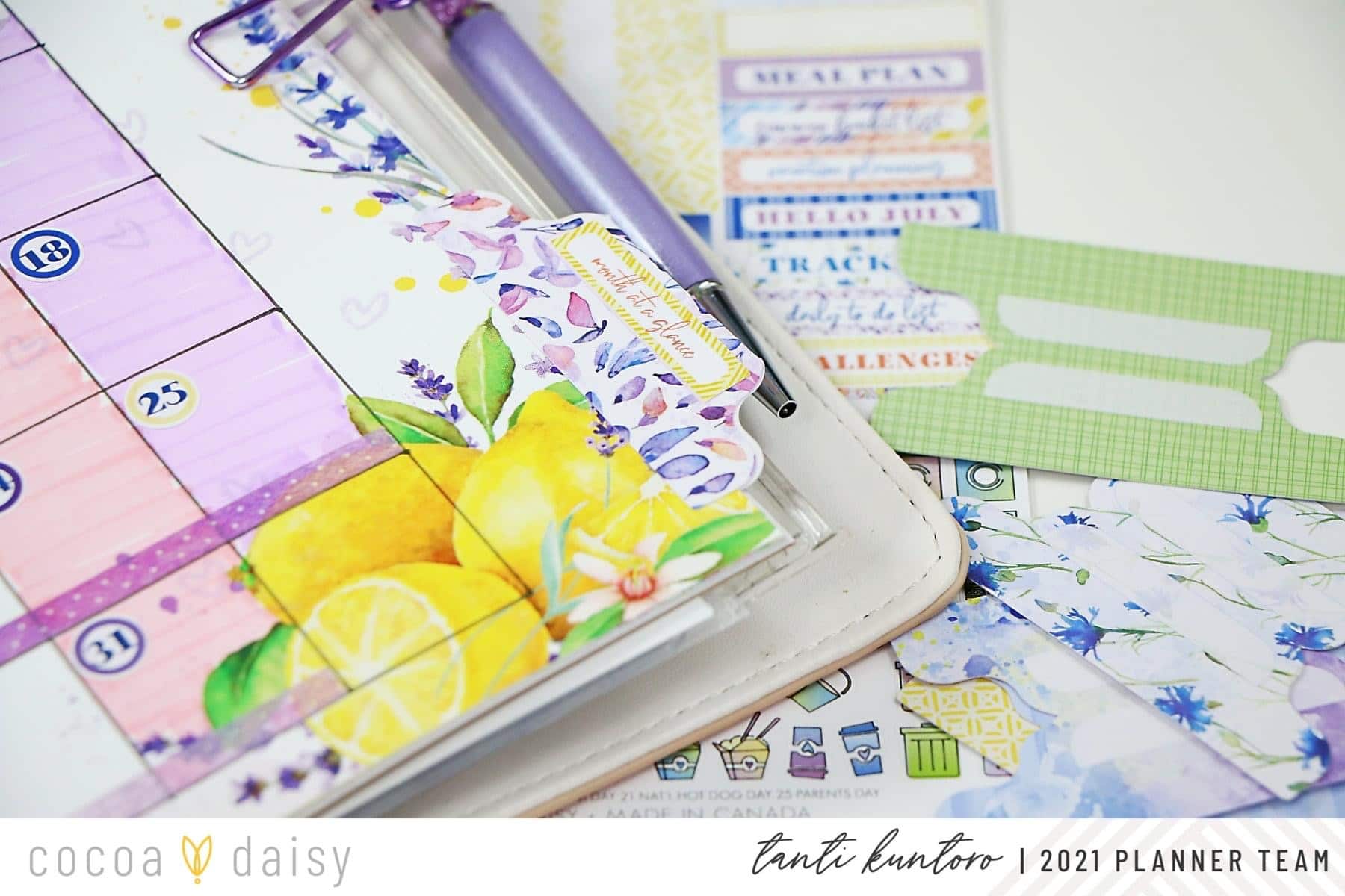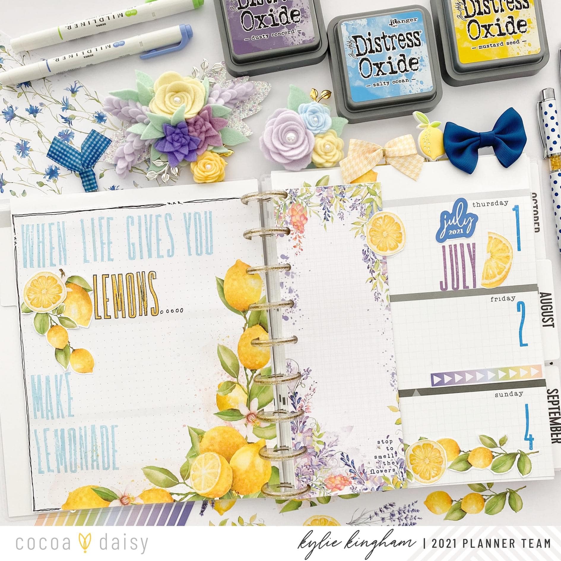 I trimmed one of the A5 decorative note pages to fit my planner before punching space for my discs. I couldn’t resist adding a fun quote with some of the Cocoa Daisy Alpha stamps which layer beautifully. I also fussy cut more lemons to add even more colour.