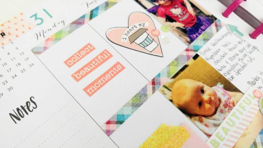 I always start out covering the right side of my planner pages, that is if the colors that are already there don’t match what I’m wanting to use. I also do it if I just want to use some pretty paper, lol. I cover my separating lines and then I move into the day to day. I place pictures with their corresponding days and start adding the pretty stuff.