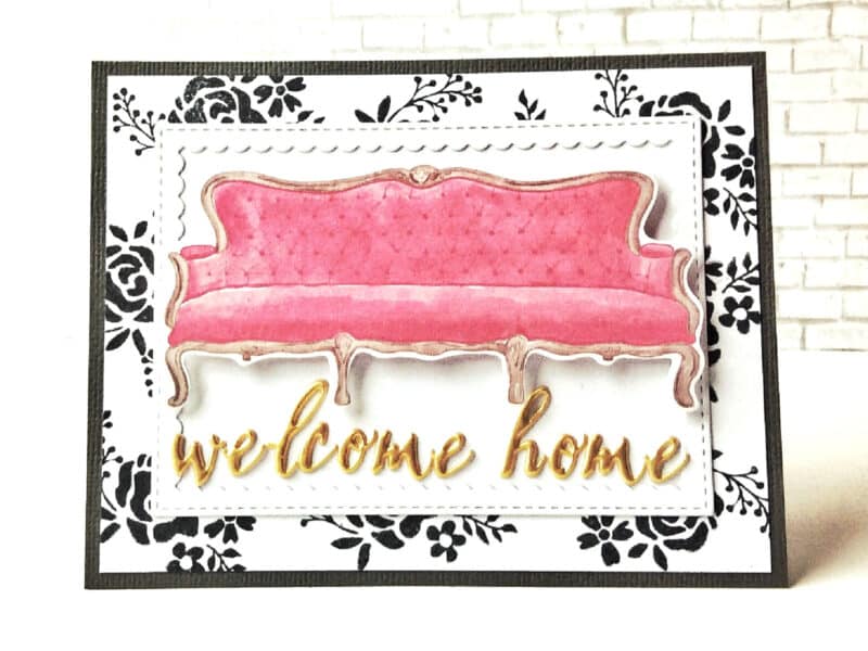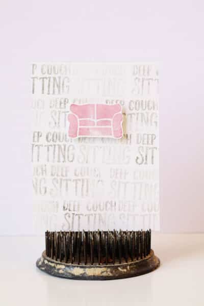 I created this DITL 3×4 card by background stamping in first and second generation impressions the “deep couch sitting” sentiment and then I stamped the couch image, fussy-cut it and adhered it with foam adhesive for a bit of dimension.