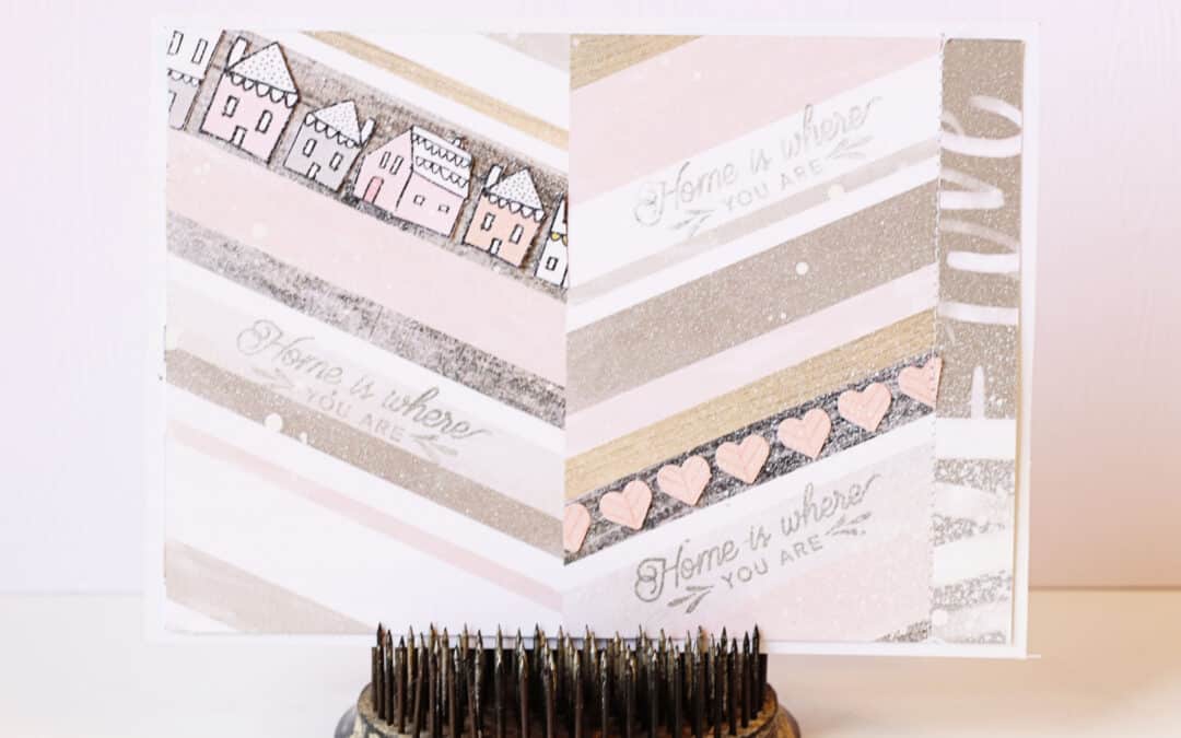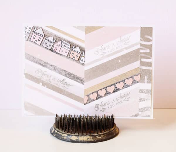 This card was created using the “”home is where you are” stamp from the main kit.  I added a bit of spray mist for a wintry weather(ed) look and some machine stitching.  The houses were fussy cut and the little hearts were made with a mini heart punch.