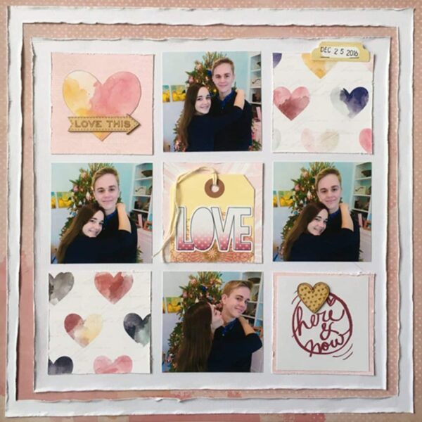 Kelly also keeps the frames and she tears the paper, as Kylie did. Kelly has shifted the title of her layout, “Love”, to the center of the page and she has left little white space, thus maximizing her use of the page. Such a sweet layout of Kelly’s kids on Christmas day!