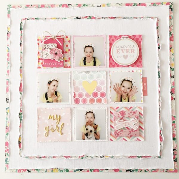 Marie’s dreamy layout kept all the same frames and grid layout that Kylie used but she used smaller pictures within the squares. I love how Marie uses tons of embellishments yet always keeps the focus of her layouts on the pictures. That darker/inner frame really captures your attention and balances the darker colors found within the layout.