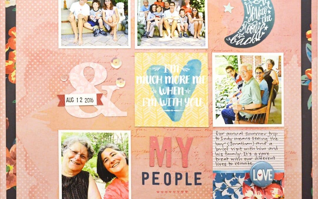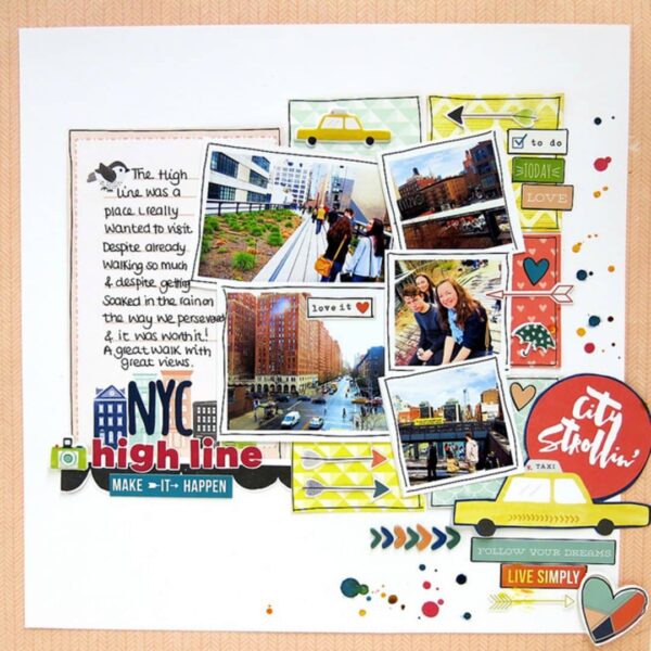 Lisa began her layout with a grid base and from there she moved outside the box! Lots of action and movement here in Lisa’s layout with her signature pops of yellow and doodling. While it isn’t an exact replica, you can see the resemblance between Kylie’s inspiration and Lisa’s finished product.