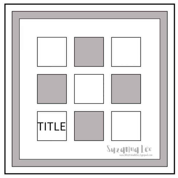 3 x 3 grid; check! Four pictures; check! Frame; check! I shifted my pictures around a tad thus necessitating a change of title placement as well. I also went with “visual” squares for three of the boxes. I toyed with patterned paper, machine stitching and outline, vellum and a number of other potential options but nixed them all. I liked the idea of the additional space on the page. Your eye draws a box around those spaces instead.