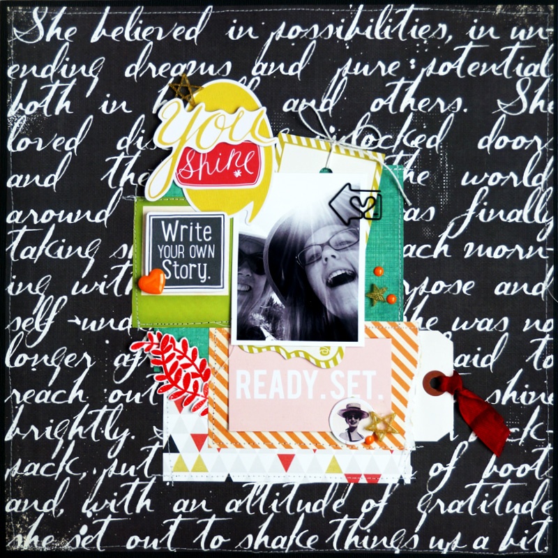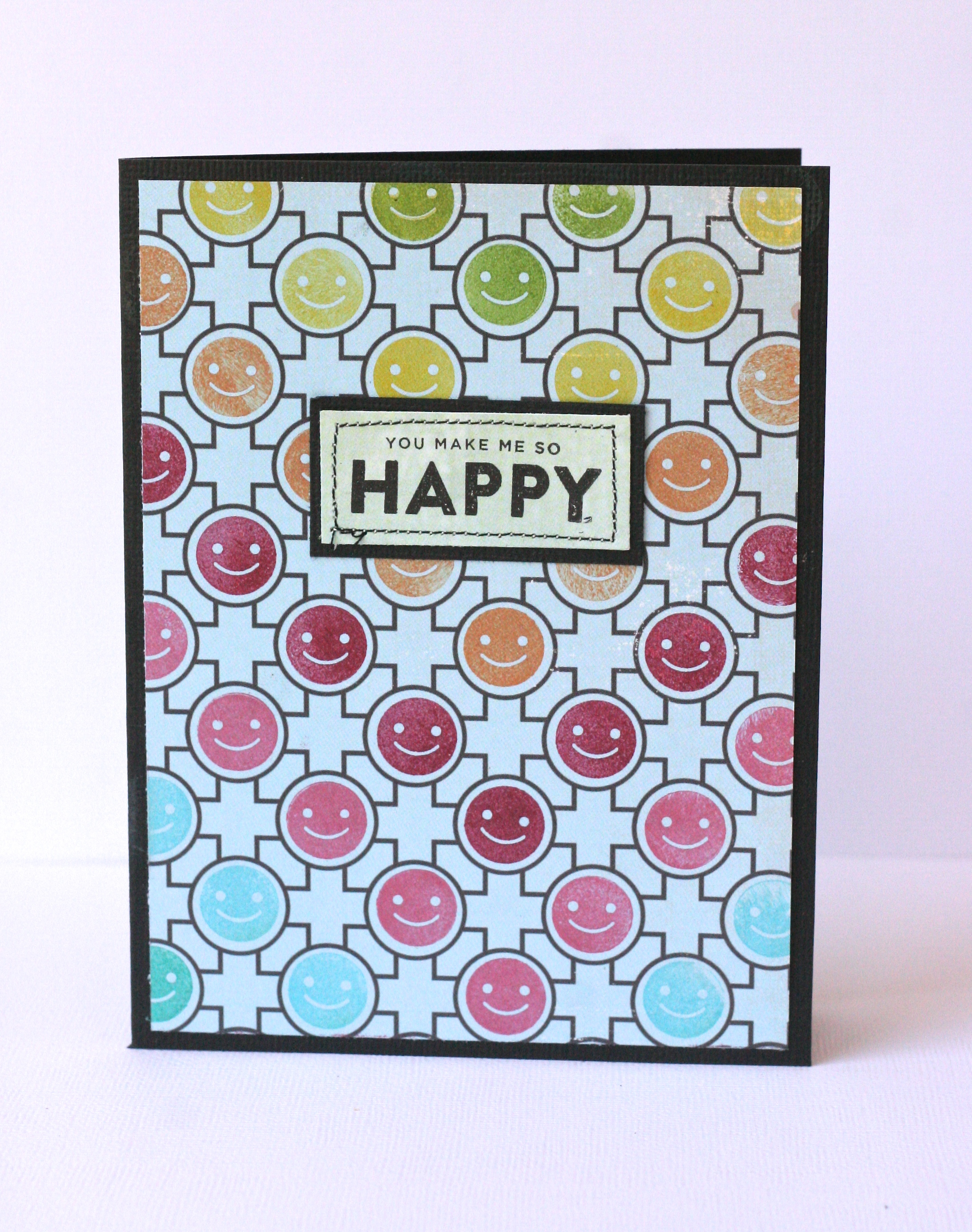 This month’s stamps all rock however I found a particular affinity for the Emoticons stamp set and got a bunch of use out of them here with two cards, a layout and a 3×4 DITL card that I stamped onto.