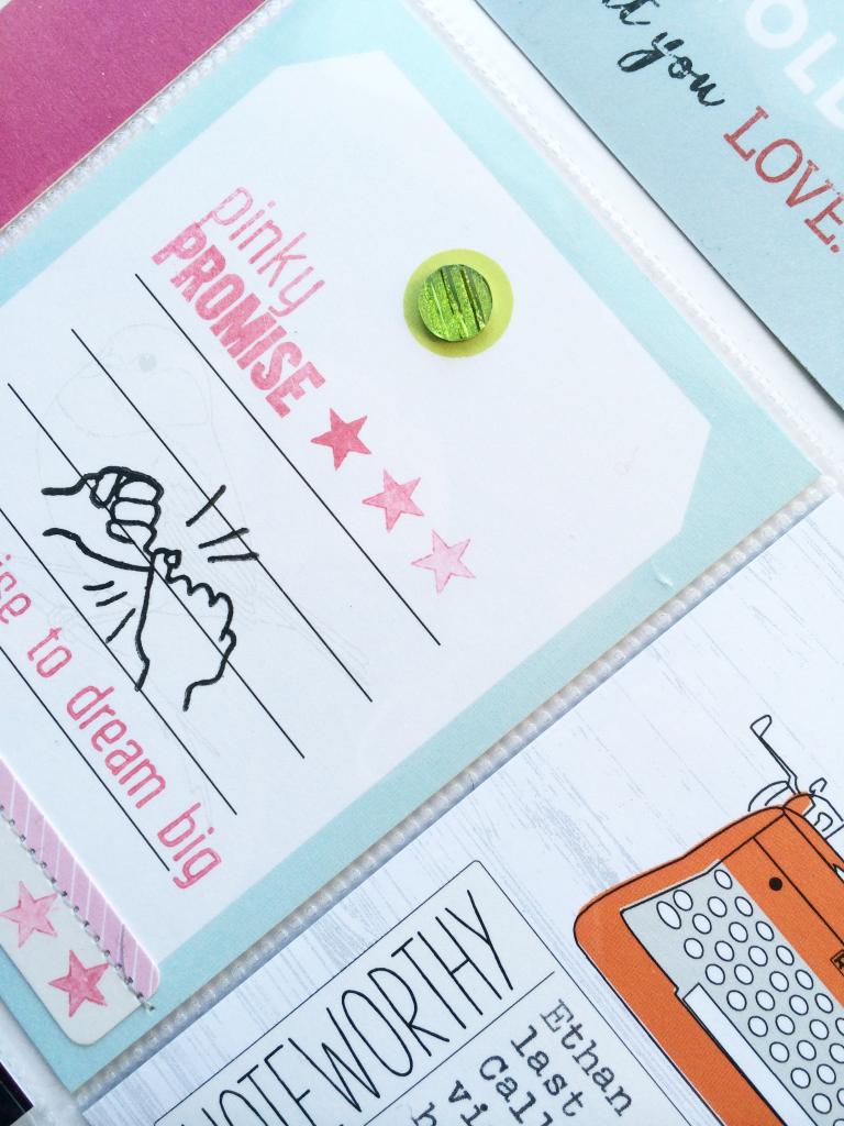 And then the adorably fun “pinky promise” stamp Arleigh created for the August stamp sub! Love it so much! And seriously, right after I completed this spread, my two boys actually made a pinky promise on something (I wish I could remember what now-Ack!) Just too awesome! Here I have used it on a card as part of my DITL spread.