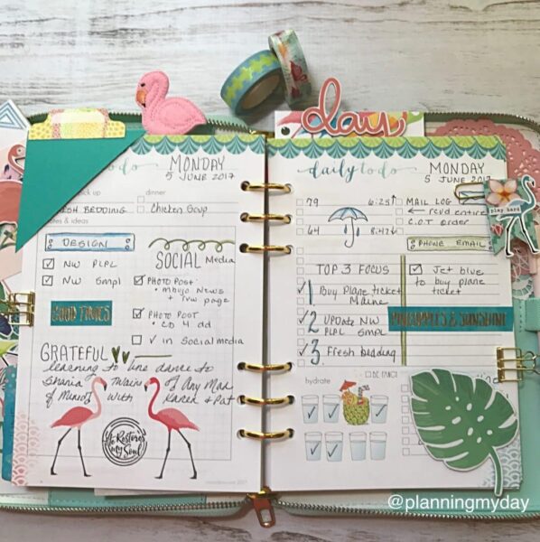 Below I’ve shared two full face view’s of my dailies!  I wanted to show you how simple it is to use your dailies without a lot of design and stickers, sometimes life just moves too fast.   The Cocoa Daisy planner sheets in-and-of themselves are already gorgeous and fun enough!!  Here’s a tip; be sure to figure out ahead of time the top 4-5 things you want to record in your daily, so you have a focus! Ideas: Step count, Dinner, Meals, Mail, Gratitude, News headline of the day, weather, Appointments, Tasks ……..etc