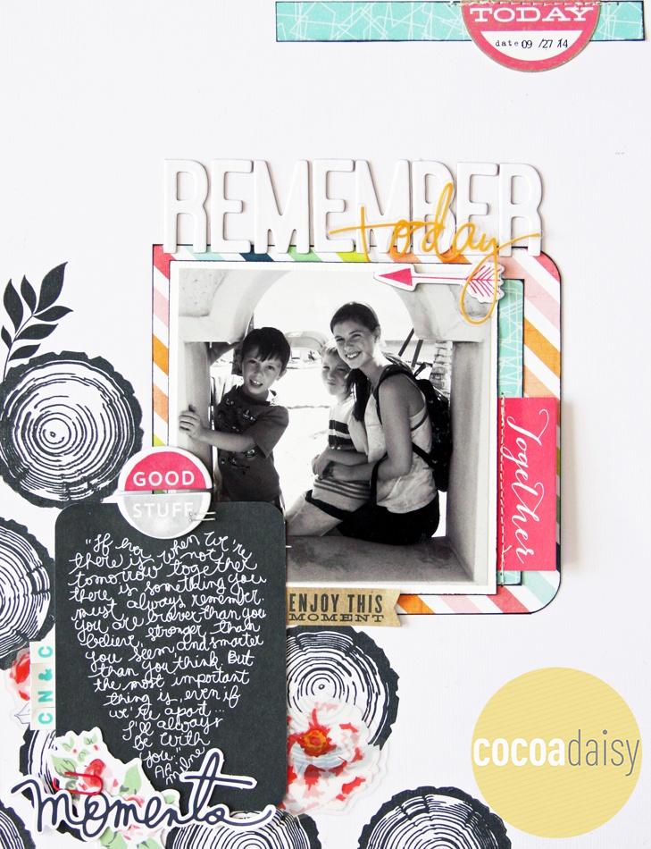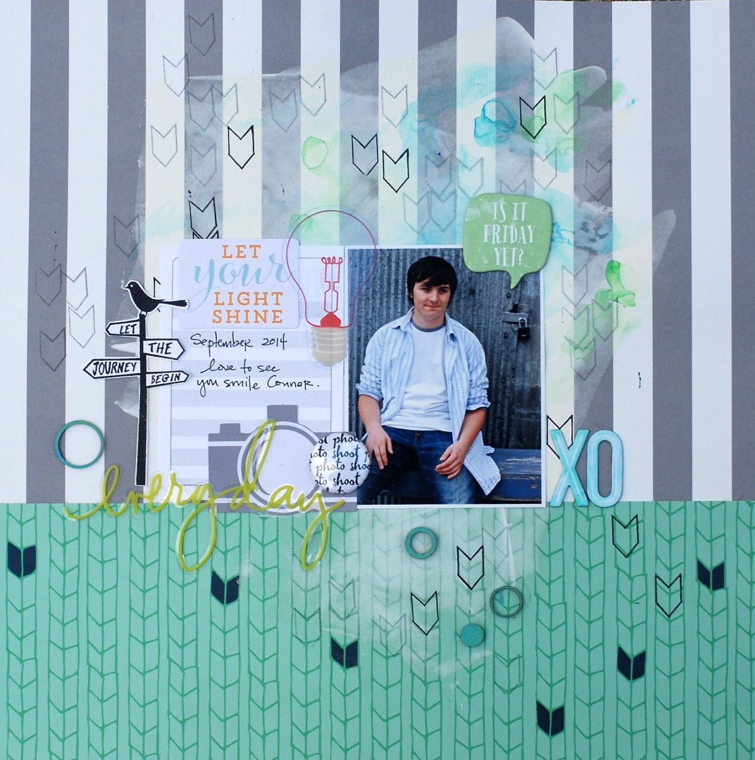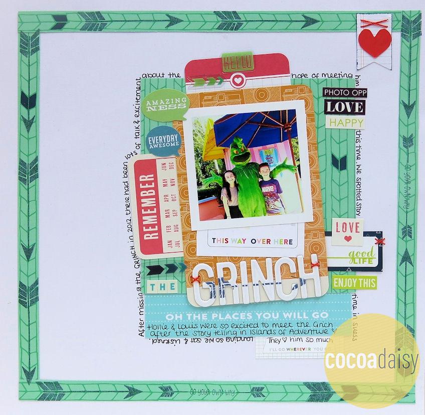 Next, Lisa used the main kit arrow stamp to create a fun border around her page. She also stamped the arrow across the white chipboard letters in her title – I love that idea! I also love all the layering and the happy photo in this layout!