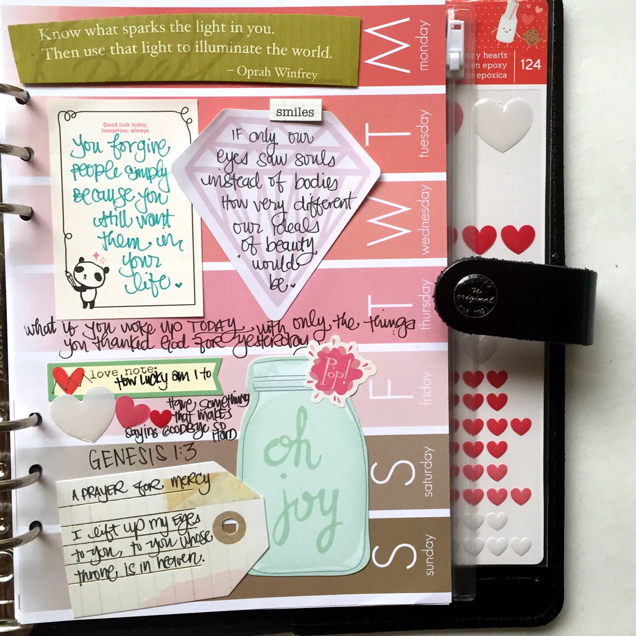 Hey everyone, Florence here! I am excited to share with you how I am using my February inserts. My style is very scrappy and I wanted to show you how I utilize this area for positivity and motivation. Depending on the week, I know for me, some weeks are more tough than others. I like to pre-write the quotes or bible versus so I can view them that day. The first week of February I utilized some of the stickers that came in the kit and printed some positive quotes to the left.
