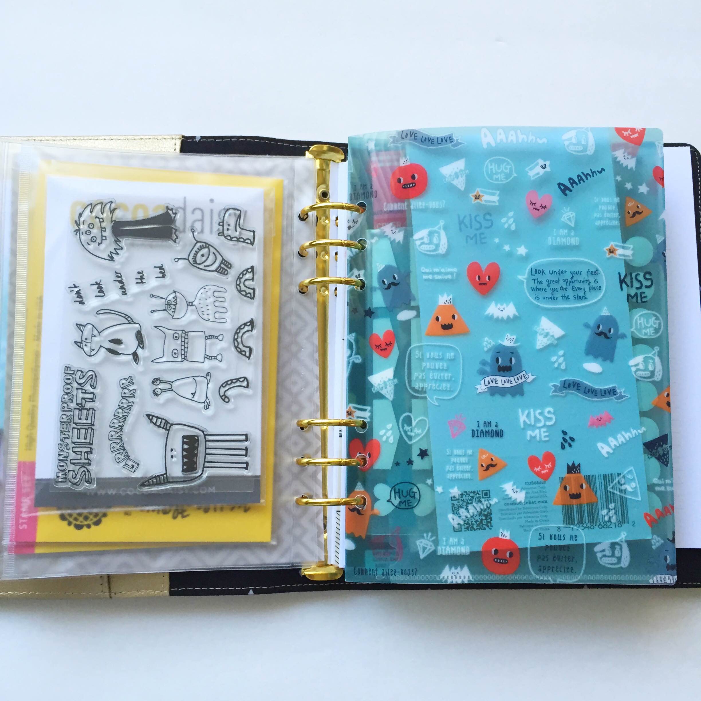 I am doing something new this time around. I added a side zippy which holds 3 stamp sets including this months, and to the right, is a cute folder I punched holes in. I would like to call this, happiness unfolding.